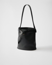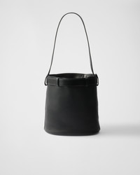 The sophisticated and modern essence of the Prada Buckle bag is rediscovered in a new bucket silhouette with a sleek shape. The belt with iconic buckle enhances the versatile and contemporary design. - Product code: 1BE085_2CY9_F0002_V_SBO - Decorative belt with buckle - Leather handle, drop from 28 cm to 36 cm - Metal hardware - Lettering logo stamped on the front - Nappa leather interior with patch pocket - Imported Height: 29cm Width: 26.5cm Length: 18cm MATERIALS Main material: Calfskin