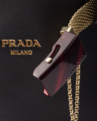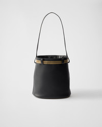 The eclectic and sophisticated essence of the Prada Buckle bag is rediscovered in a new bucket silhouette with a sleek shape. The jeweled belt made of metallic mesh with a tortoiseshell-finished plaque buckle, completes the soft design with a touch of contemporary elegance. - Product code: 1BE085_2HIF_F0002_V_SBC - Decorative metallic mesh belt with plaque buckle - Leather handle, drop from 28 cm to 36 cm - Metal hardware - Lettering logo stamped on the front - Nappa leather interior with patch pocket - Imported Height: 29cm Width: 26.5cm Length: 18cm MATERIALS Main material: Calfskin