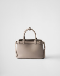 Clean lines and refined elements tell the story of Prada's dual aesthetic that blends simplicity and detail, functionality and elegance. This small leather bag summarizes Prada's stylistic codes in a pragmatic yet sophisticated design, with nappa leather interior characterized by three compartments. The silhouette is animated by the distinctive touch of the leather belts, both refined and modern. The hot-stamped lettering logo in 22 kt gold leaf adds a precious signature to the bag. - Product code: 1BA418_2CYS_F0D32_V_OOO - Decorative straps with buckles - Leather handles - Detachable, adjustable leather shoulder strap Maximum length 110 cm - Minimum length 100 cm - Maximum drop 55 cm - Minimum drop 50 cm - Metal hardware - Lettering logo printed on the front - Nappa interior with center pocket - Imported Height: 18cm Width: 28cm Length: 10.5cm MATERIALS Main material: Calfskin