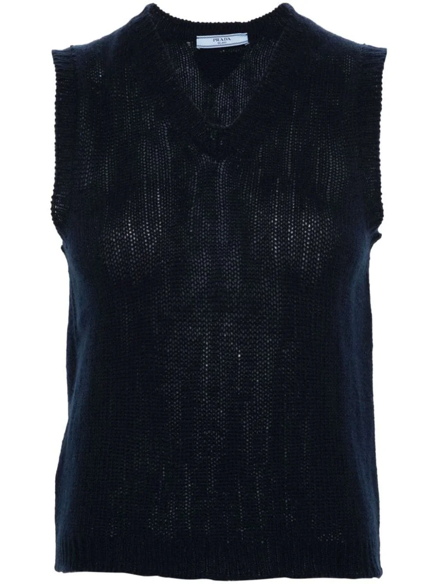 navy blue cashmere knitted construction semi-sheer construction triangle logo to the rear V-neck sleeveless ribbed trim straight hem This piece fits true to size. We recommend you get your regular size Model is 1,75m / 5ft 8in wearing size 40 (IT) Gender: Women Material: CASHMERE 100% Color: BLUE Made in: IT Product ID: P29A9614KDF0008 *Import tax/duty will be calculated at checkout (If applicable)