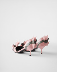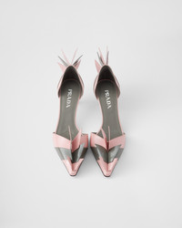 Bold and free creativity is expressed in the new Prada shoe collection through 3D details that create architectural shapes. - Product code: 1I971N_05G_F04HZ_F_B055 - Screen-printed triangle logo - Leather sole with rubber heel tip and metal lettering logo - Varnished heel, height 55 mm - Imported MATERIALS Main material: Calfskin