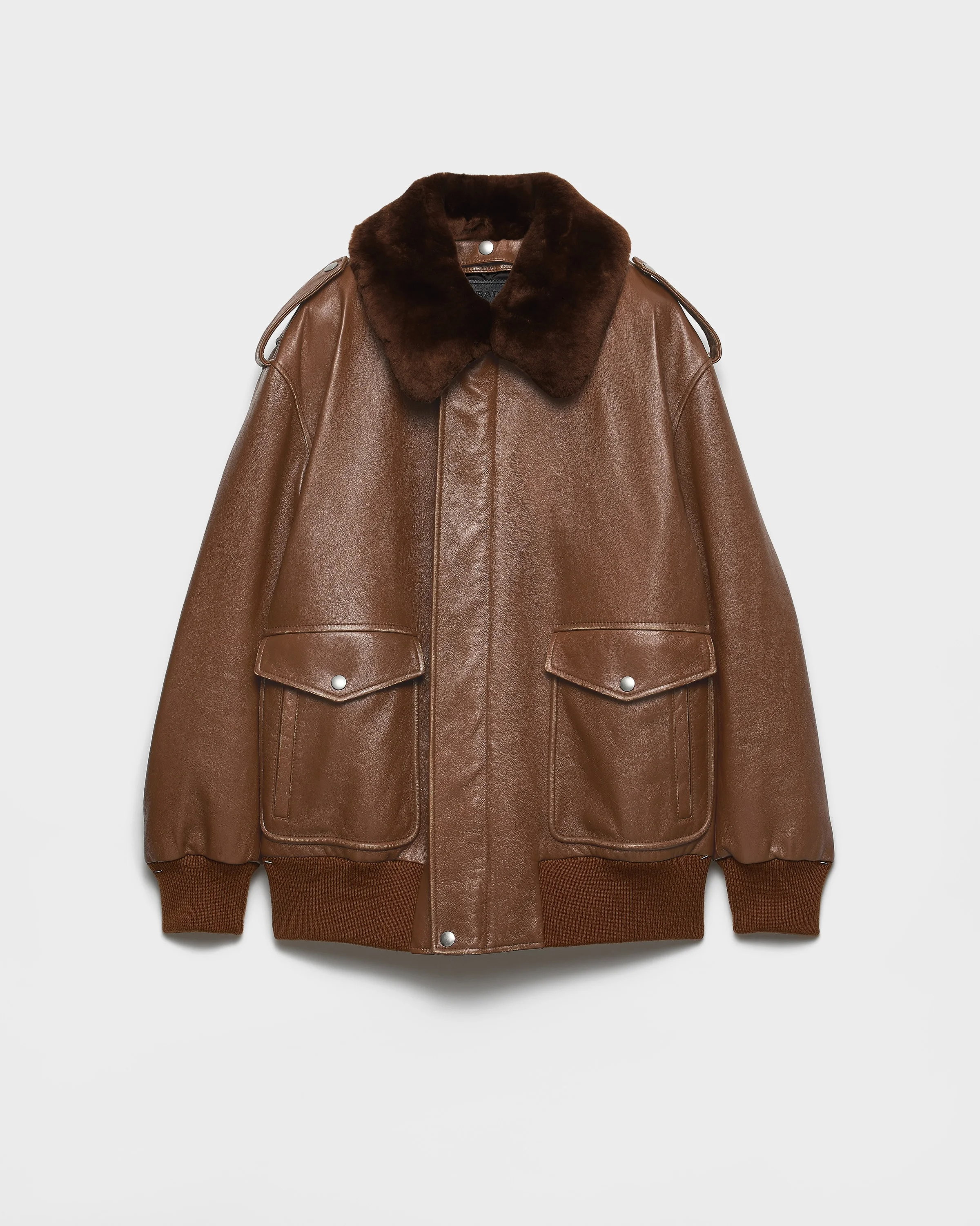 With an oversized design that reinterprets a menswear silhouette, this bomber jacket embodies a sophisticated style with vintage charm. The garment is made of nappa leather with a vintage finish and oversized silhouette, lightly padded and quilted inside, embellished with a soft shearling collar. - Product code: 58A234_162B_F0134_S_OOO - With padded, quilted lining - Oversized fit - Center zipper closure - Detachable shearling collar - Straight sleeves with ribbed knit cuffs - Flapped pockets - Ribbed knit hem - Leather triangle logo on the back - Vintage treatment - Imported - The model is 177 cm tall and wears a size 38 Height: 68cm MATERIALS Main material: Lambskin