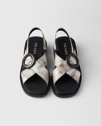 Prada's iconic crisscross band sandals are reinterpreted for the season with new proportions and a reworked sole in rubber and leather, which makes the style extremely light and flexible while maintaining its refined look. - Product code: 1X962N_P39_F0009_F_035 - Upper with logo-engraved Plexiglas buckle - Rubber monoblock sole with hot-stamped logo - Heel height, 35 mm - Imported MATERIALS Main material: Calfskin