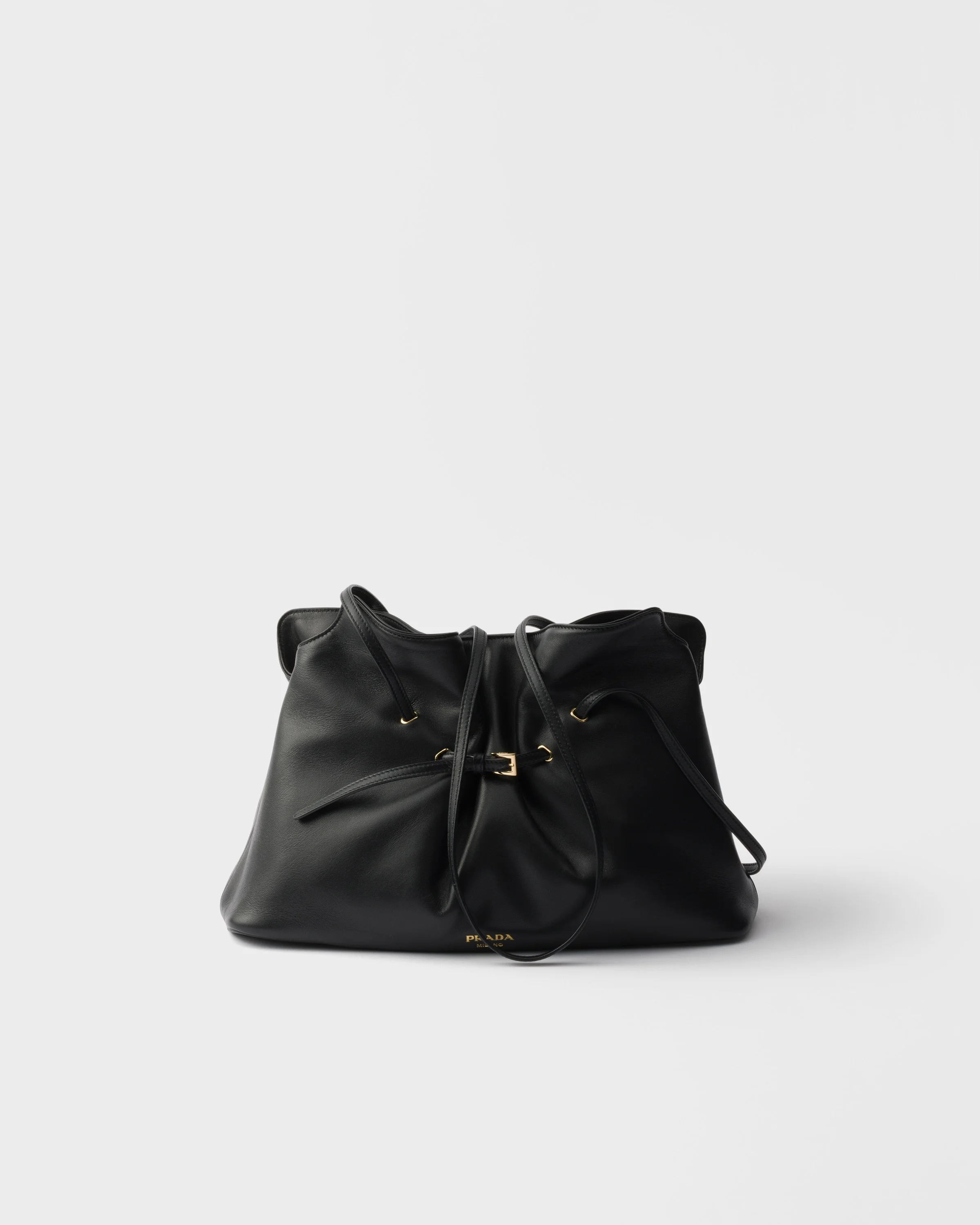 The Dada bag embodies natural and authentic elegance balancing form and function. A narrow strap shapes the ample volume of the nappa leather accessory, forming soft folds and gathers. The light, feminine construction is completed by long handles for refined and practical use. - Product code: 1BG594_2DX8_F0002_V_OOO - Nappa leather handles, drop 33 - Metal hardware - Embossed lettering logo on the front - Magnetic closure - Nappa leather lining with center compartment and patch pocket - Imported Height: 24cm Width: 33cm Length: 11cm MATERIALS Main material: Lambskin