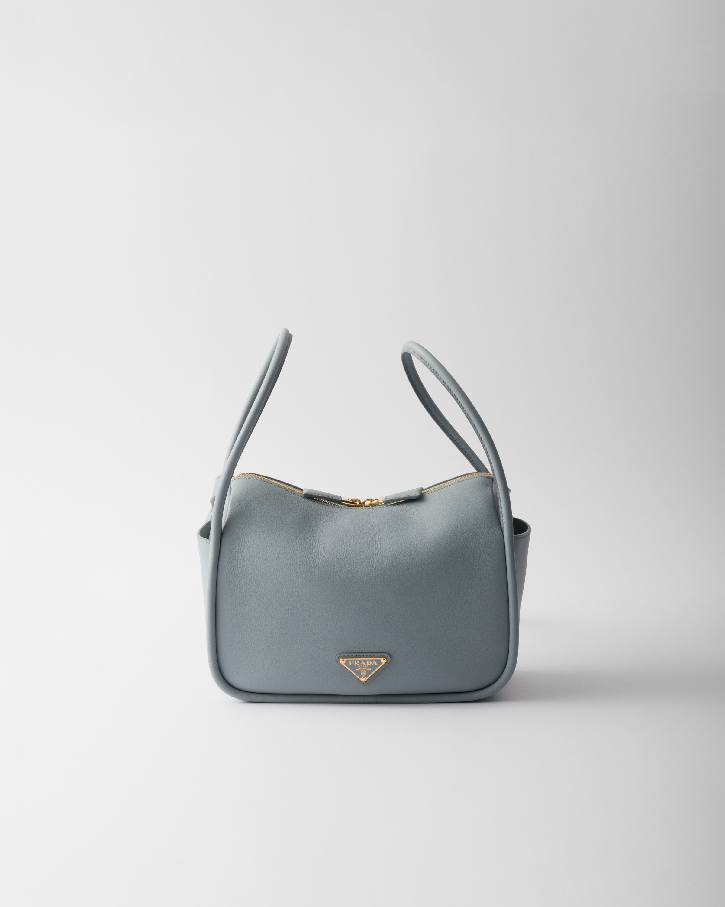 A contemporary design with a casual attitude defines this handbag with refined details illuminated by metal hardware. The compact and versatile style features clean, minimalist lines emphasized by the buttery touch of soft grain leather. The accessory, an expression of exceptional artisanal know-how, is decorated with the enameled metal triangle logo. - Product code: 1BA451_2CYS_F0384_V_OVO - Double leather handles, drop 13 - Removable leather shoulder strap, length 75 cm - Open side pockets - Metal hardware - Enameled metal triangle logo on the front - Zipper closure - Logo-print nylon lining with patch pocket - Imported Height: 18cm Width: 25cm Length: 10.5cm MATERIALS Main material: Calfskin