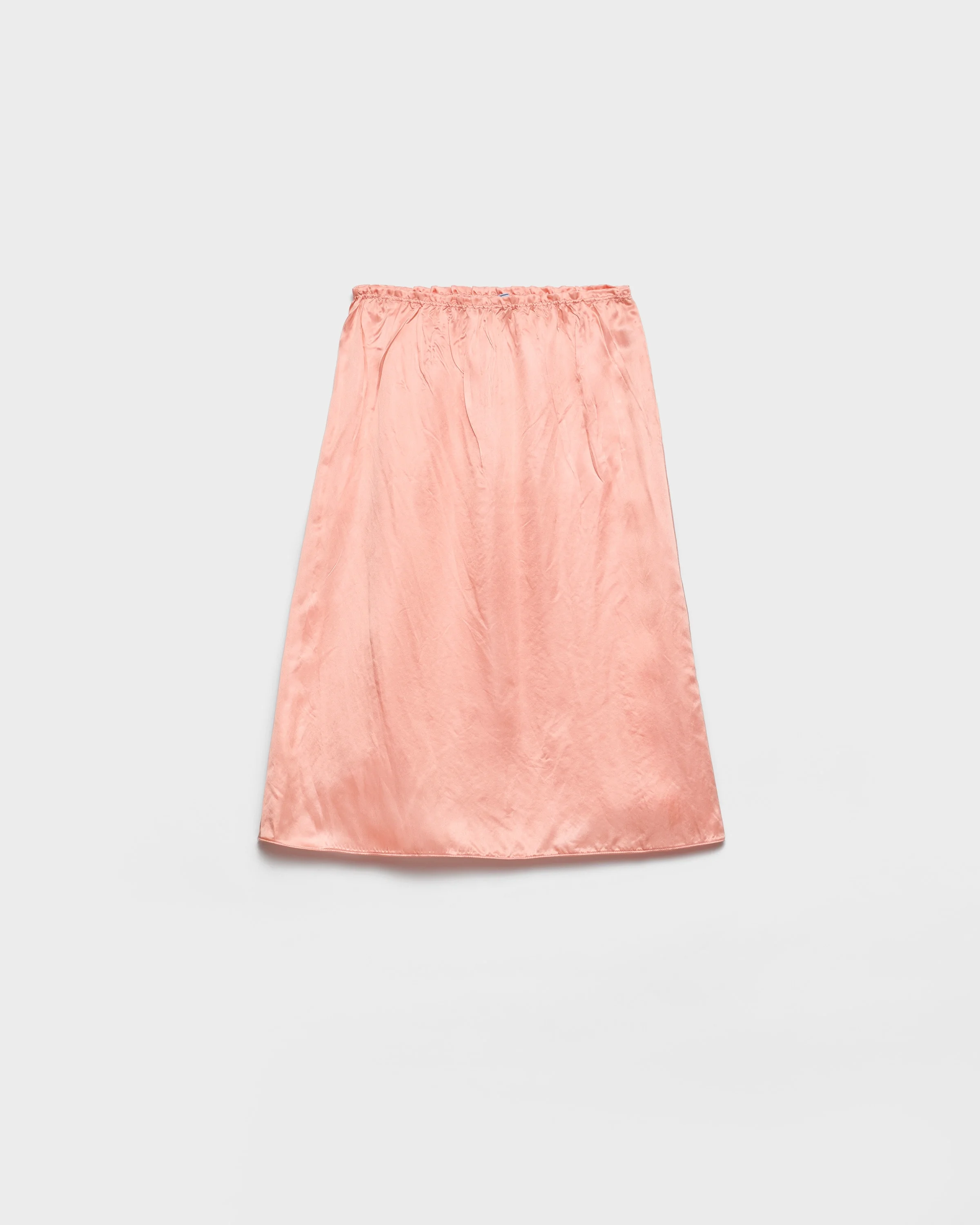 This satin skirt embodies Prada's dual aesthetic with a casual, elegant design. The vintage finish adds an unexpected character to the light, romantic silhouette. - Product code: P199WG_17Z2_F0311_S_OOO - Pencil silhouette - Padded fabric triangle logo - Imported Height: 65cm MATERIALS Main material: 36% silk 64% viscose
