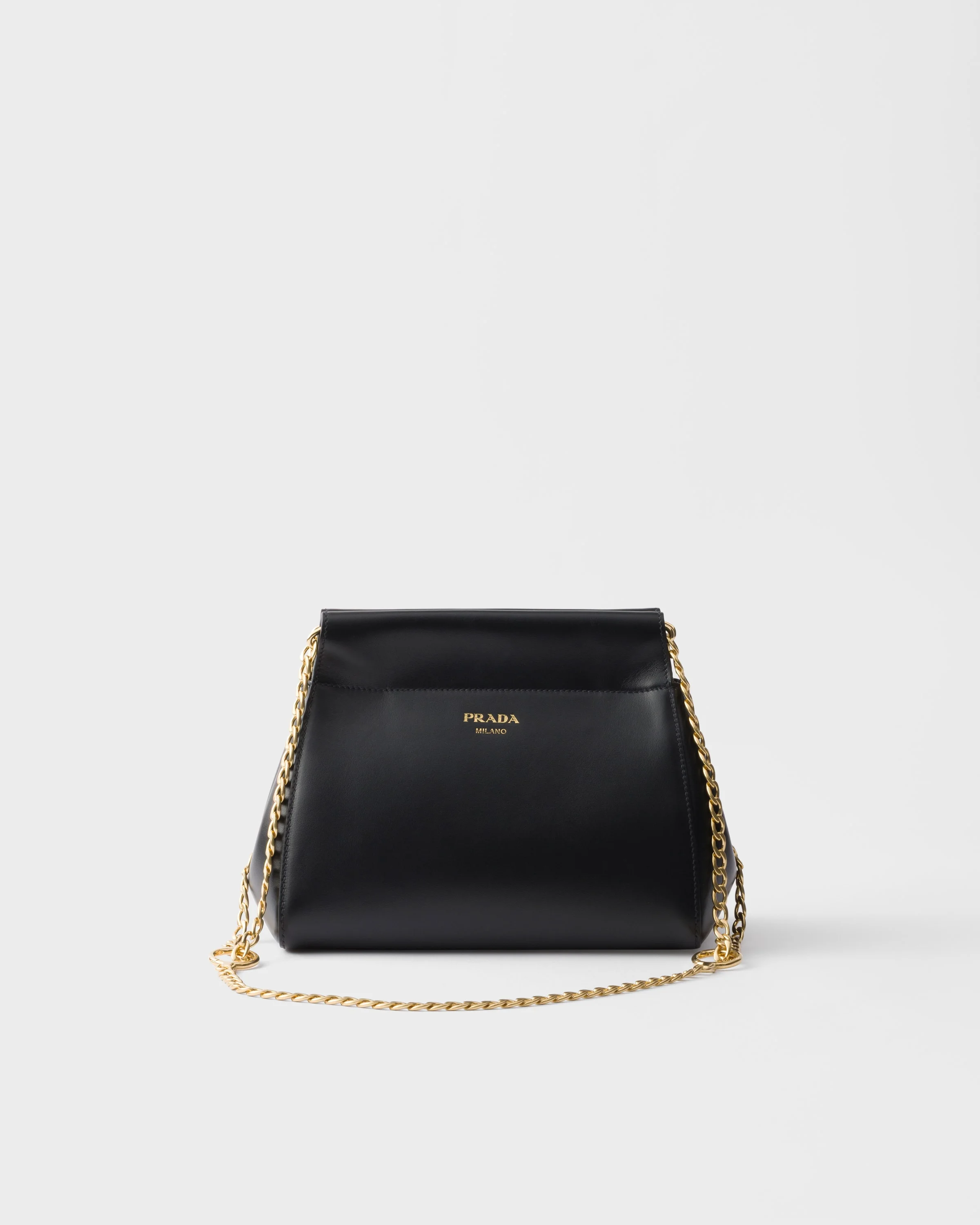 The contemporary and feminine Enchaine bag resembles a charming vintage silhouette, transforming it with new volumes and proportions. The leather design is embellished with chain handles that suggest modern and sophisticated gestures. - Product code: 1BC263_2HIA_F0002_V_COO - Chain handles - Removable chain shoulder strap, length 40, drop 37 cm - Metal hardware - Embossed lettering logo on the front - Magnetic closure - Nappa leather lining with zipper pocket - Imported Height: 18cm Width: 22cm Length: 11.5cm MATERIALS Main material: Calfskin