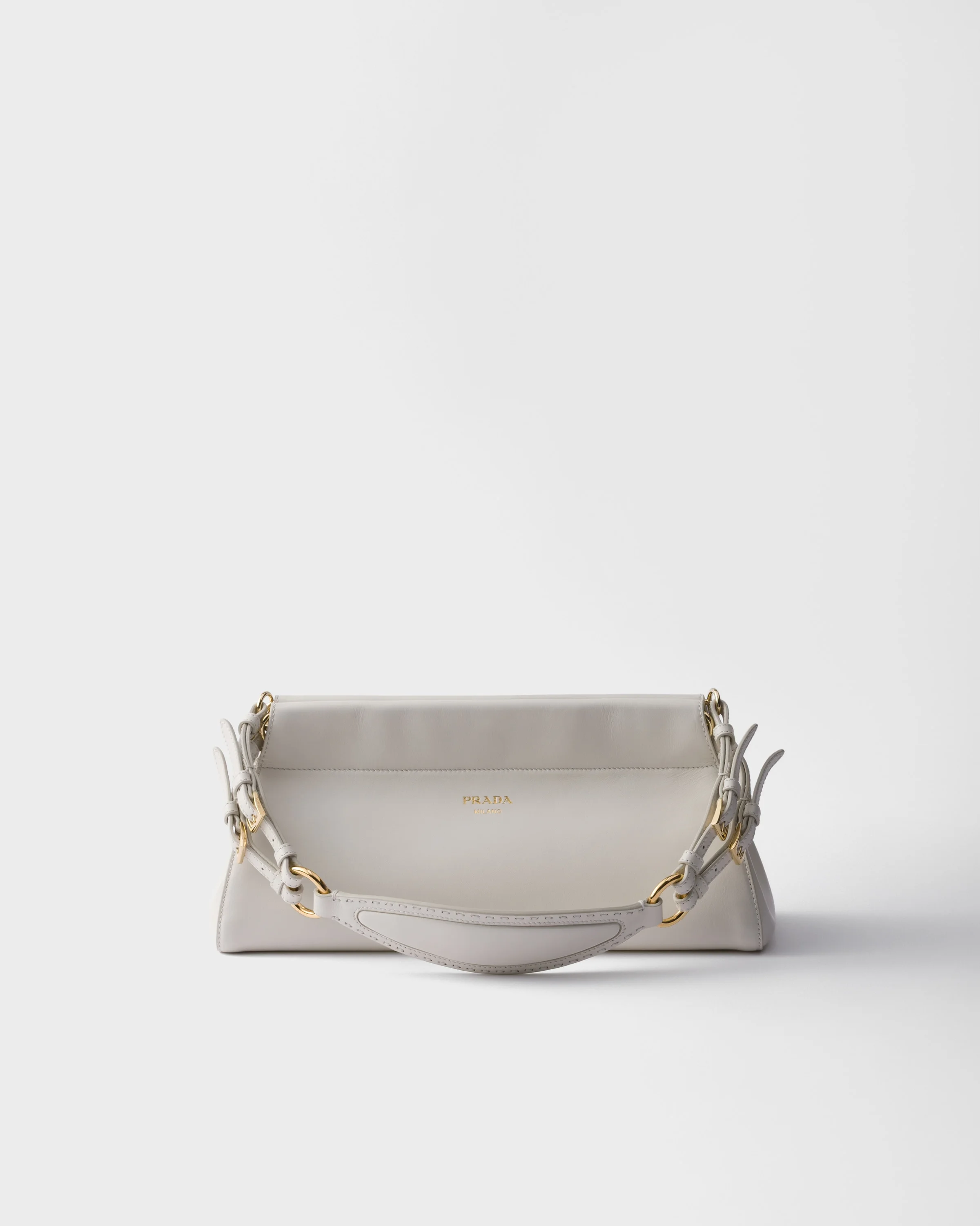 The Enchaine bag features a silhouette with vintage allure, reinterpreted with a pragmatic and contemporary construction. The classic, feminine shape is enriched with soft volumes and leather handle, finished with archive details that reveal the artisan essence of the accessory. Completed with the lettering logo, the design embodies a modern and sophisticated style. - Product code: 1BC262_2HIA_F0009_V_SOO - Removable leather handle - Metal hardware - Stamped lettering logo on the front - Nappa leather interior with zipper pocket - Imported Height: 15.5cm Width: 32.5cm Length: 11cm MATERIALS Main material: Calfskin