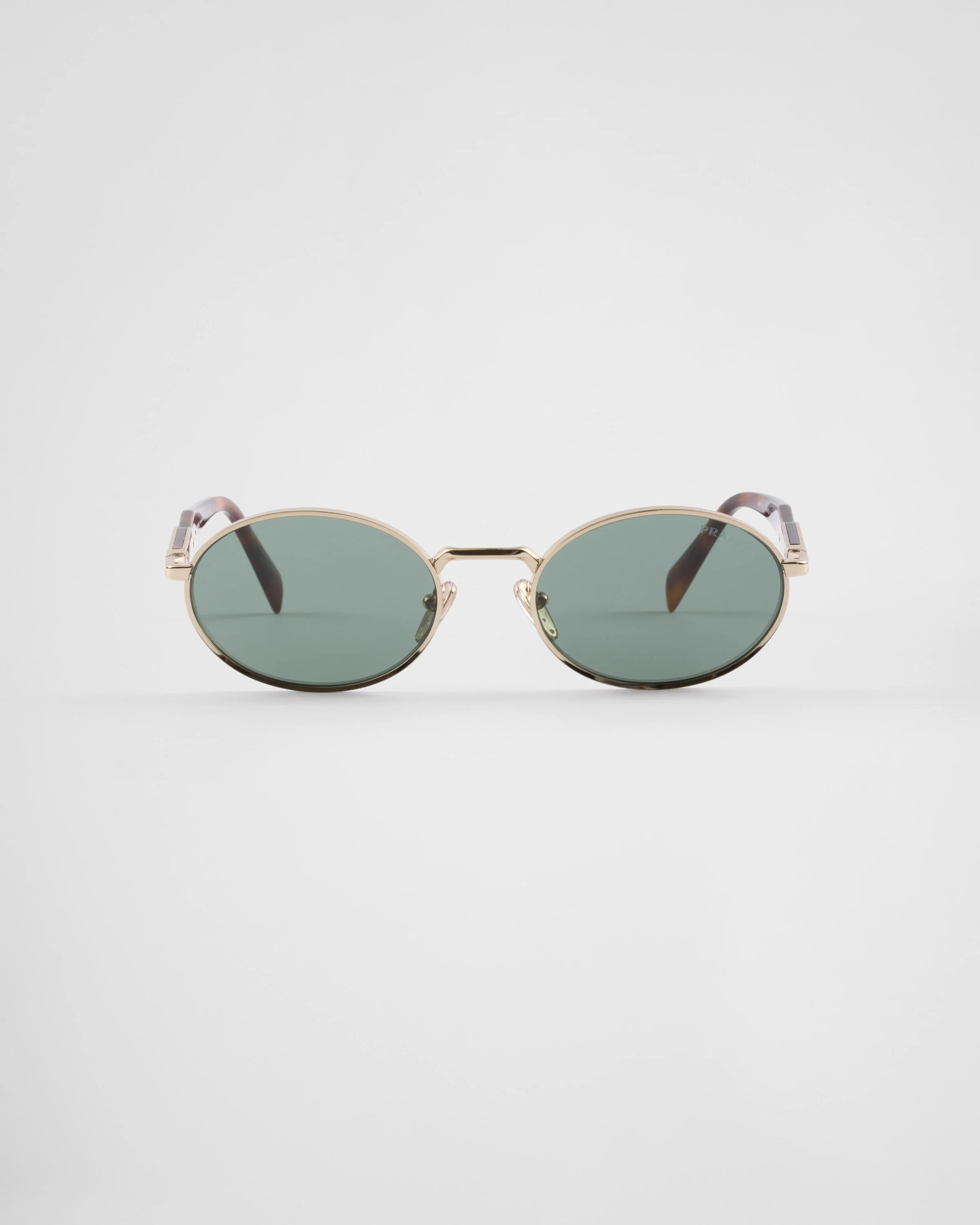 Sunglasses with an elegant, contemporary style. The oval front is outlined with refined metal rims and combined with sophisticated acetate temples decorated with the Prada logo finely engraved on a metal element. - Product code: SPR65Z_EZVN_FE70L_C_055 - Metal frame front - Color: Pale Gold - Frame compatible with graduated lenses - 100% UVA / UVB protection - Adjustable nose pads suitable for any fit - Lens-nose-temple measurements: 55-20-140 mm - Article comes with dedicated packaging - Other colors available - Imported MATERIALS Metal