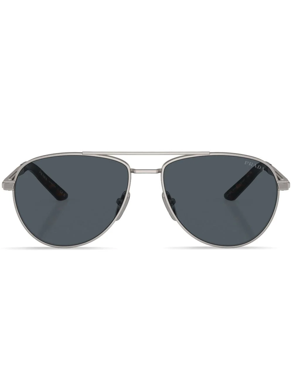 logo-print pilot sunglasses Prada's take on pilot sunglasses is sleek and contemporary – they boast a thin metal rim with a classic brow bar and a matte finish. As an understated branding touch, the arms are punctuated with the brand's logo. Highlights - Silver-tone - Metal - Logo print at the arm - Tortoiseshell-effect detailing - Pilot frame - Grey tinted lenses - Metal brow bar - Nose pads - Straight arms - Curved tips - These glasses come with a protective case. Composition Metal 100%