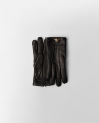 Short Nappa leather gloves lined with cashmere. The outside features embroidered details and a prominent metal Prada logo. - Produktcode: 1GG74C_038_F0002 - Nappa gloves - Cashmere lining - Short fit - Embroidered details - Metal Prada logo - Eingefuhrt MATERIALS Hauptmaterial: Recycled polyester