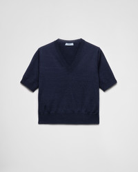This wool sweater with a refined, timeless design is characterized by its boxy fit with short sleeves and a V-neck. - Product code: P24M2R_16SW_F0008_S_OOO - Short sleeves - Plain knit - Boxy fit - Ribbed knit neck trim - Semi-raglan shoulder - Ribbed knit sleeve trim and hem - Triangle logo - Imported - The model is 179 cm tall and wears a size 38 Height: 48cm MATERIALS Main material: 100% virgin wool