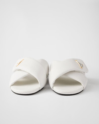 Characterized by a refined and versatile style, these slides are made of padded nappa leather that emphasizes the clean, contemporary lines of the design. The enameled metal triangle logo embellishes the style, completed by thin rubber soles. - Product code: 1XX713_ZHP_F0009_F_005 - Enameled metal triangle logo - Monoblock rubber sole, 5 mm, with hot-stamped logo - Imported MATERIALS Main material: Lambskin