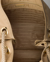 Original combinations animate this Re-Nylon bag inspired by the timeless codes of nautical style. The sliding cord handles define the versatile accessory with an oversized silhouette, completed by the enameled metal triangle logo. For sustainable care to preserve the product's characteristics and reduce microfiber shedding, we recommend not washing the item too often. Let the product air out after every use and have it dry cleaned at a specialized ecological dry cleaners. - Product code: 1BC244_2HG8_F0040_V_OOO - Cord and leather handle - Metal hardware - Enameled metal triangle logo on the front - Magnetic closure - Logo-print Re-Nylon interior with zipper pocket - Imported Height: 39cm Width: 48cm MATERIALS Main material: Recycled polyamide