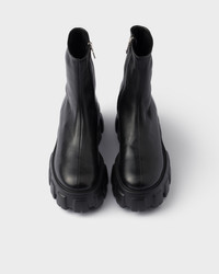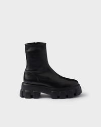 A distinctive design with bold volumes defines these booties with bold contrasts, an expression of the inherent duality in the Prada aesthetic. The iconic Monolith soles, geometric and modernist, add unique character to the stretch nappa leather style. - Product code: 1U117O_L68_F0002_F_G055 - Leather lining - Side zipper closure - Boot leg:18 cm - Monoblock rubber lug sole, height 55 mm - Removable leather-covered insole - Imported MATERIALS Main material: Lambskin