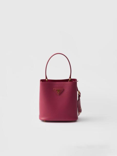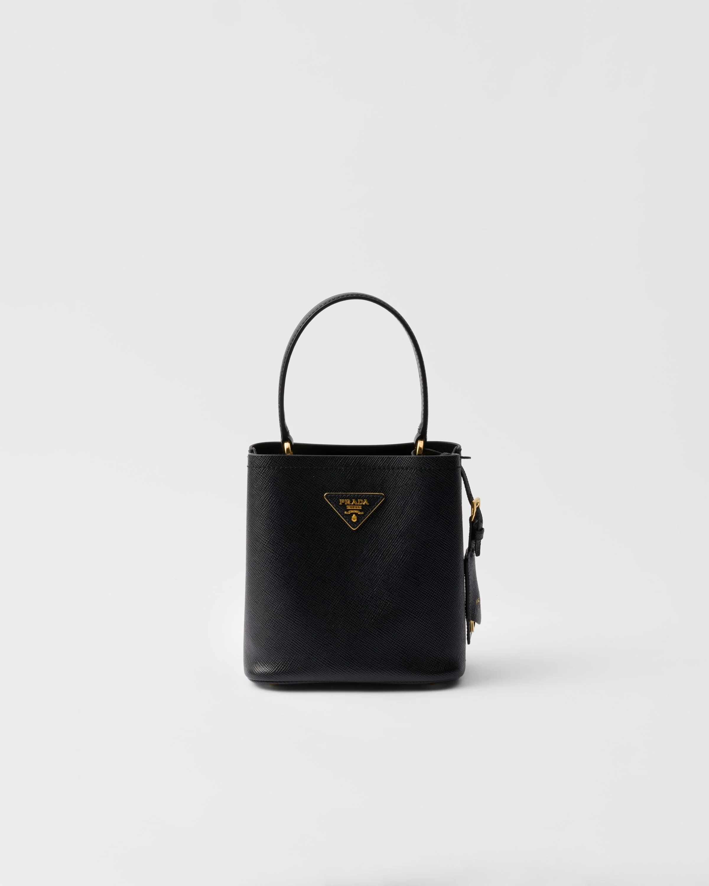 The sleek, geometric silhouette of the Prada Panier bag is reinterpreted in a compact and refined mini version. The accessory made of Saffiano leather, an emblematic material of Prada collections, is embellished with sophisticated details that express artisan excellence. - Product code: 1BA217_2ERX_F0002_V_OOD - Leather handle - Detachable, adjustable leather shoulder strap, length 105 cm. Maximum length 110 cm - Minimum length 100 cm - Maximum drop 57 cm - Minimum drop 52 cm - Removable leather key ring - Metal hardware - Metal lettering logo on leather triangle on the front - Magnetic closure - Nappa leather interior with center pocket - With purse feet - Imported Height: 18cm Width: 17cm Length: 10.5cm MATERIALS Main material: Calfskin