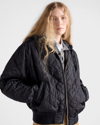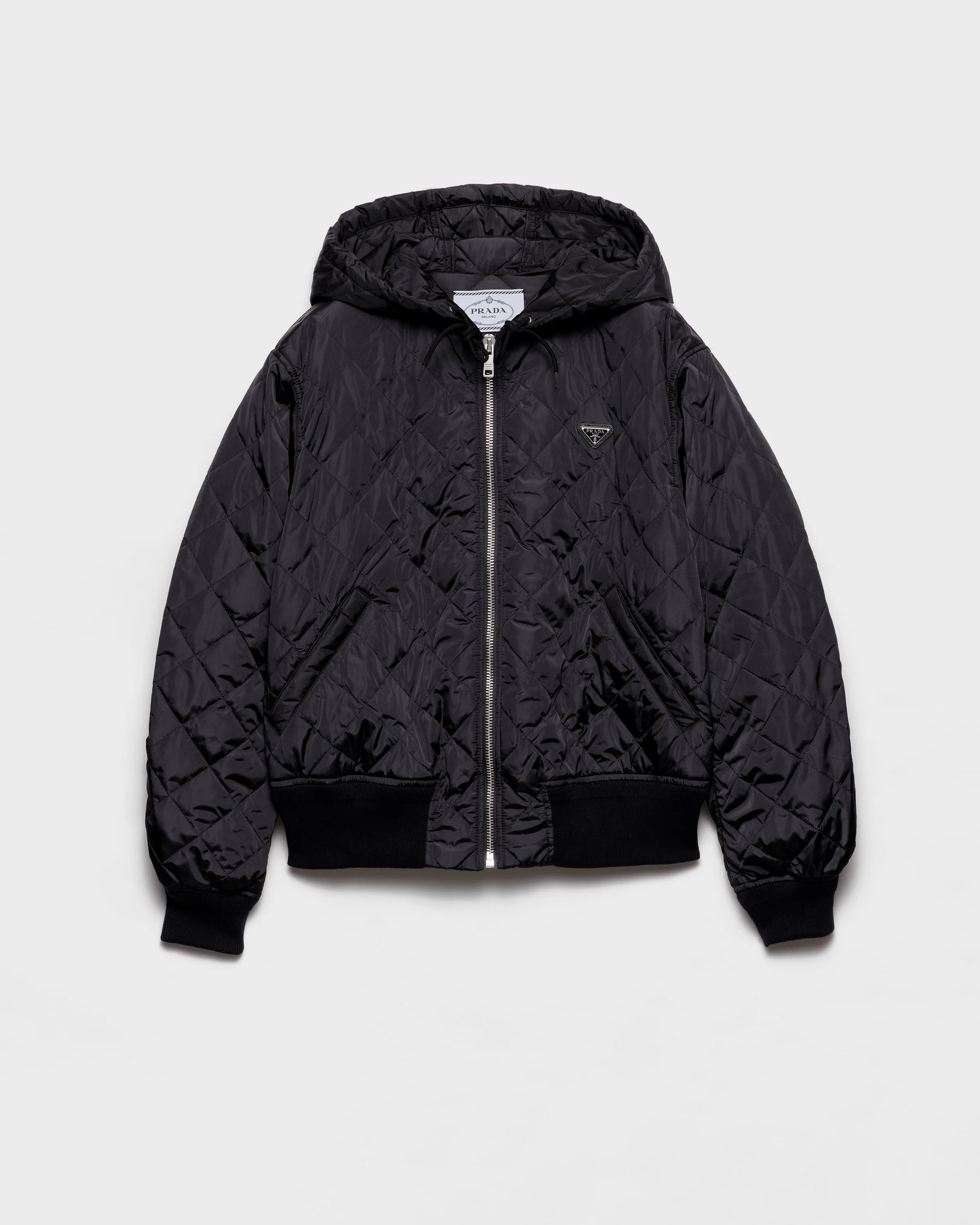 This casual yet refined jacket is made of lightweight Re-Nylon with a quilted motif. The style is defined by an oversized silhouette with hood and ribbed knit hem and cuffs. The enameled metal triangle logo adds its distinctive signature touch to the garment. For sustainable care to preserve the product's characteristics and reduce microfiber shedding, we recommend not washing the item too often. Let the product air out after every use and have it dry cleaned at a specialized ecological dry cleaners. - Product code: 29C265_1WQ9_F0008_S_OOO - Quilted - With hood - Long sleeves - Zipper closure - Welt pockets with button - Enameled metal triangle logo - Pressed garment - Ribbed knit hem and cuffs - Imported - The model is 180 cm tall and wears a size 38 Height: 65cm MATERIALS Main material: 100% recycled polyamide