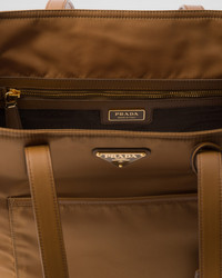 This tote bag with timeless charm, a re-edition of an archive design, sums up Prada codes in a sophisticated and pragmatic silhouette. The style with clean lines is made of Re-Nylon, an innovative regenerated nylon fabric that is the sustainable evolution of a distinctive material of the brand. Elegant Saffiano leather details complete the roomy accessory decorated with the iconic signature touch of the enameled metal triangle logo. For sustainable care to preserve the product's characteristics and reduce microfiber shedding, we recommend not washing the item too often. Let the product air out after every use and have it dry cleaned at a specialized ecological dry cleaners. - Product code: 1BG555_R064_F0134_V_OOO - Front pocket - Metal hardware - Enameled metal triangle logo on the front - Nylon lining with two pockets, including one with zipper - Imported Height: 26cm Width: 35cm Length: 15cm MATERIALS Main material: Recycled polyamide