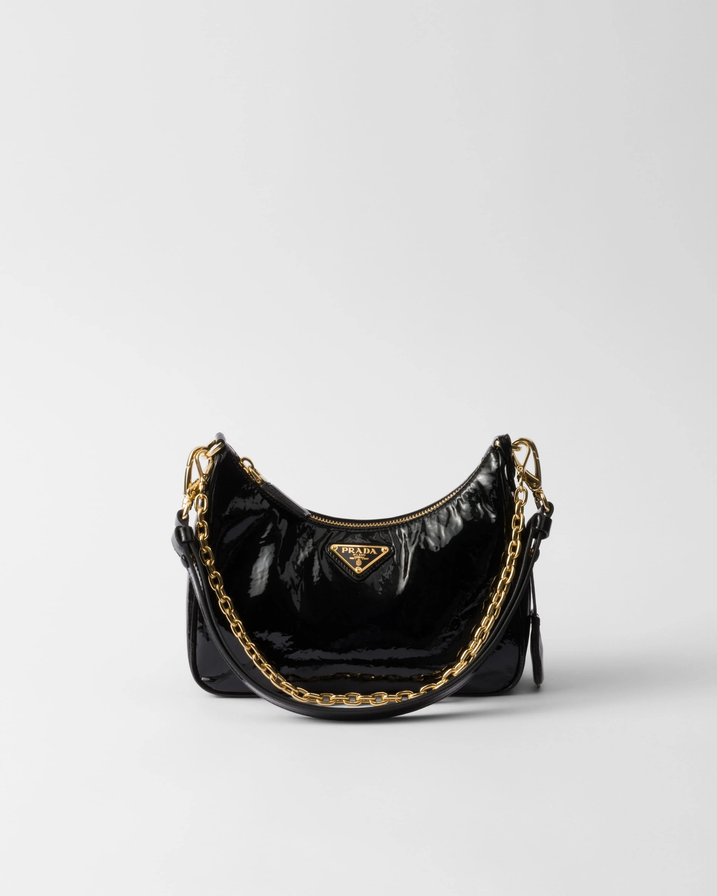 The lustrous touch of naplak patent leather and the elegance of gold-tone hardware give sophisticated, versatile allure to this mini-bag decorated with the iconic triangle logo. - Product code: 1BC204_2DNT_F0002_V_QOM - Detachable and adjustable chain handle and leather strap - Removable leather key ring - Metal hardware - Enameled metal triangle logo on the front - Zipper closure - Logo-print nylon lining - Imported Height: 18cm Width: 22cm Length: 6cm MATERIALS Main material: Lambskin