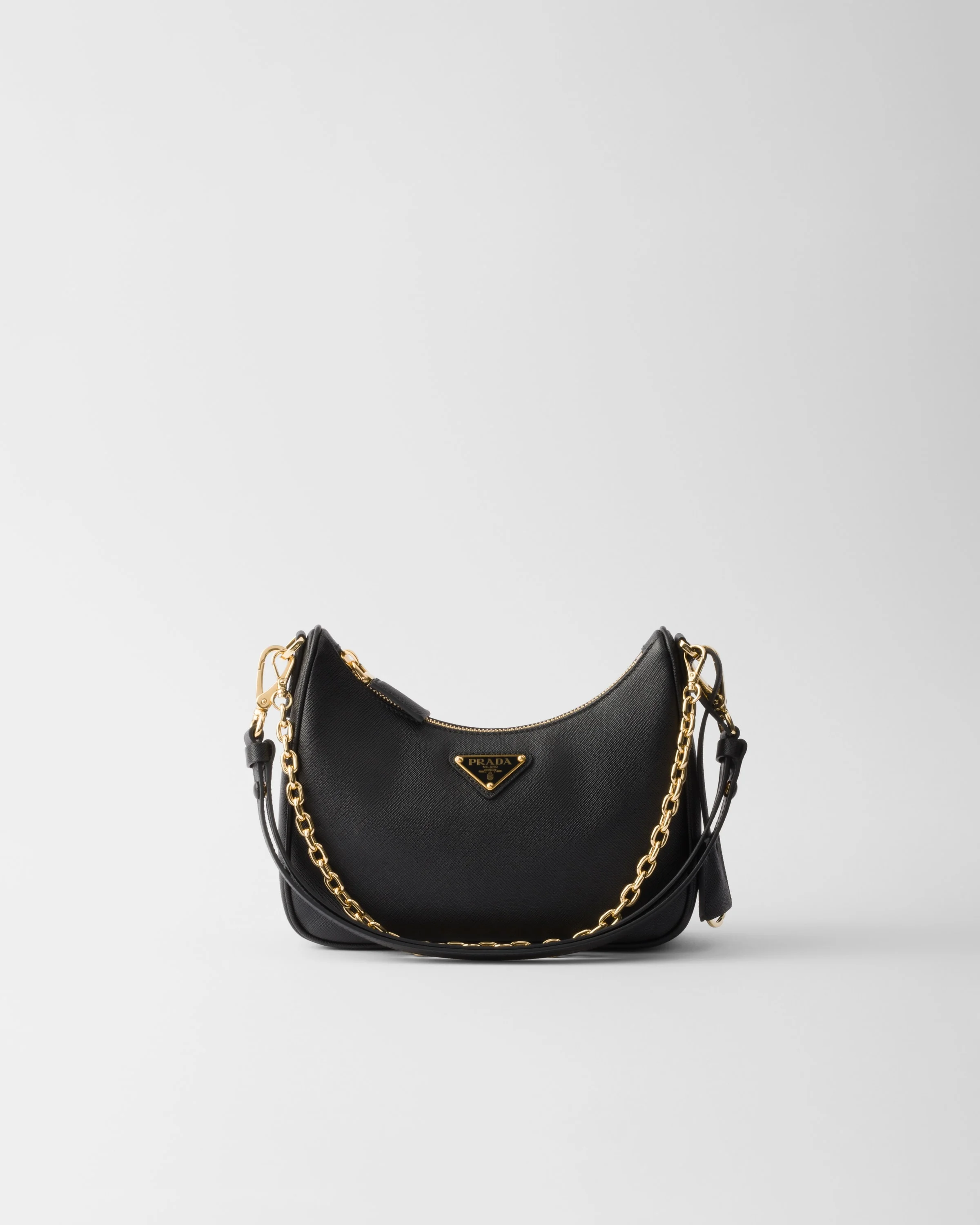 Sleek lines and iconic details define this versatile bag characterized by removable chain and leather handles. The accessory made of Saffiano leather is embellished with the distinctive enameled metal triangle logo. - Product code: 1BC204_NZV_F0632_V_QOM - Detachable, adjustable chain and leather handle - Removable leather key ring - Metal hardware - Enameled metal triangle logo on the front - Zipper closure - Logo-print nylon lining - Imported Height: 18cm Width: 22cm Length: 6cm MATERIALS Main material: Calfskin