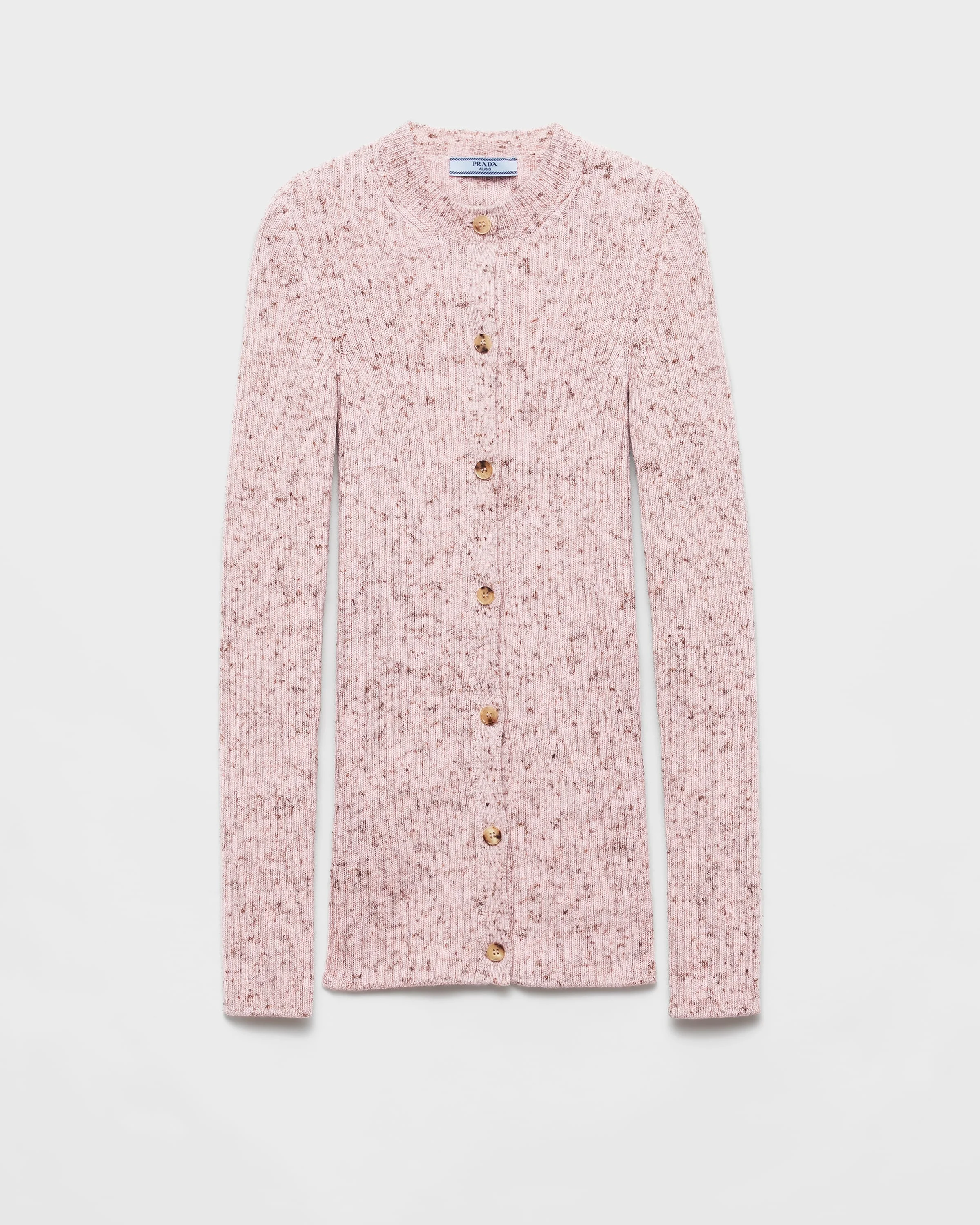 Prada knitwear combines classic lines and refined materials in elegant, timeless designs. This cardigan has a slim fit silhouette enriched by the ribbed knit motif. - Product code: P25N79_173G_F0028_S_OOO - Long sleeves - Ribbed knit - Slim fit - Ribbed knit crew neck - Raglan shoulder - Ribbed knit cuffs and hem - Knit triangle logo - Front button closure - Imported - The model is 180 cm tall and wears a size 38 Height: 67cm MATERIALS Main material: 7% Linen 27% Polyamide 66% Virgin Wool