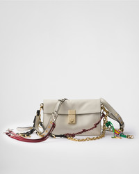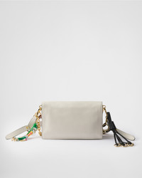 Contemporary and versatile, the new Prada Soft Sound bag is crafted from leather with a compact, two-compartment design, finished with gold-toned hardware. The accessory boasts various removable bag charms that decorate with a playful and unique touch. - Product code: 1BD379_2C6A_F0PG7_V_OO6 - Adjustable and detachable leather shoulder strap. Maximum length 90 cm - Minimum length 58 cm - Maximum drop 50 cm - Minimum drop 32 cm - Detachable bag charms - Metal hardware - Engraved lettering logo on clasp - Flap closure with snap buckles - Nappa leather lining with two compartments and two pockets, one with zipper - Imported Height: 13.5cm Width: 24cm Length: 6cm MATERIALS Main material: Calfskin