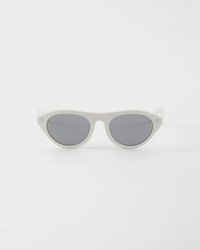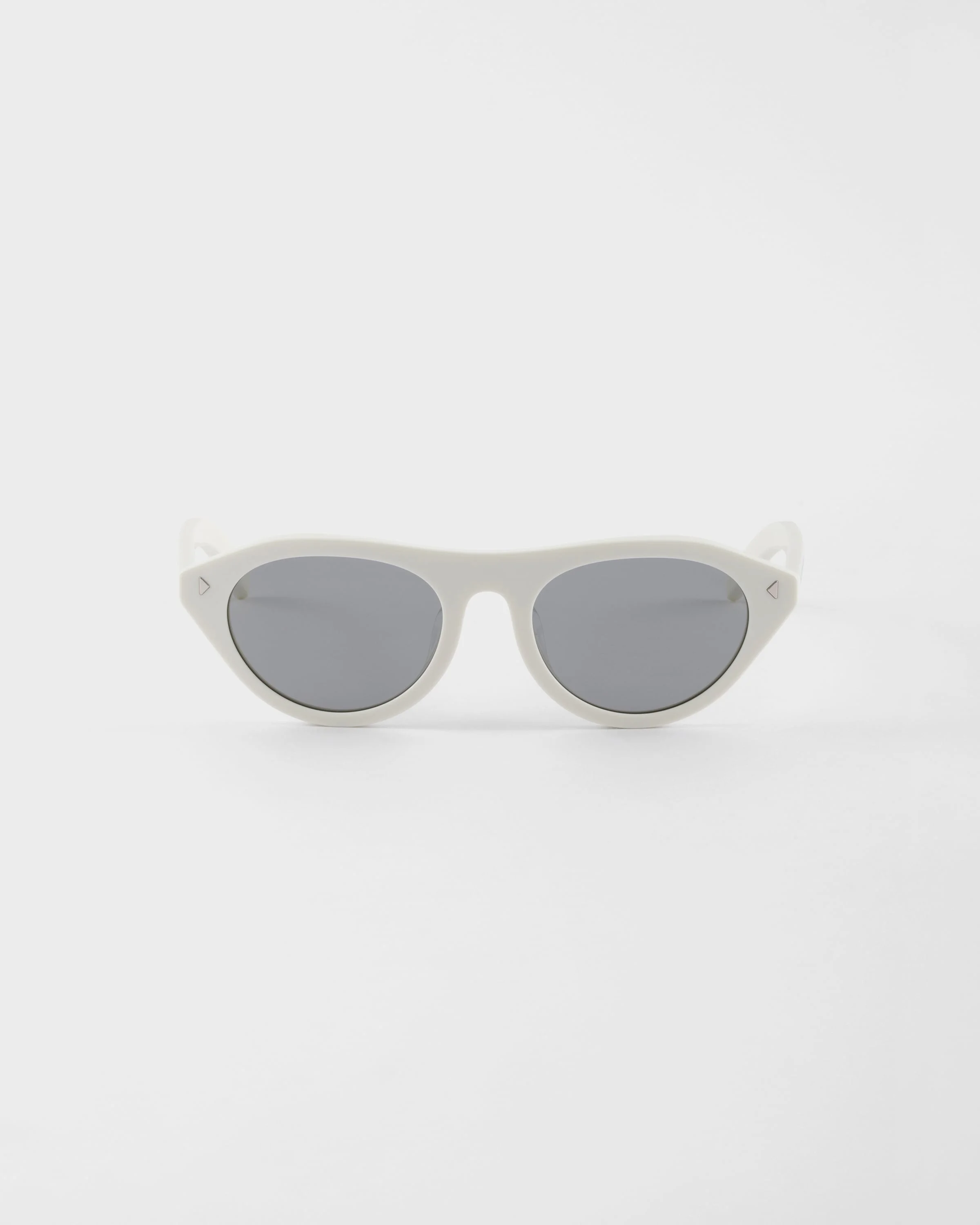 A sleek aesthetic meets the refined touch of details in these new Prada sunglasses. The acetate frame front features sophisticated triangular rivets while the temples highlight the iconic metal element enriched with the Prada lettering logo. - Product code: SPRB15_E17K_FE80R_C_051 - Acetate frame front - Color: Chalk White - Frame compatible with graduated lenses - 100% UVA / UVB protection - Crystal Lenses - Standard Fit - Lens-nose-temple measurement: 51-21-145 mm - Article comes with dedicated packaging - Other colors available - Imported MATERIALS Acetate