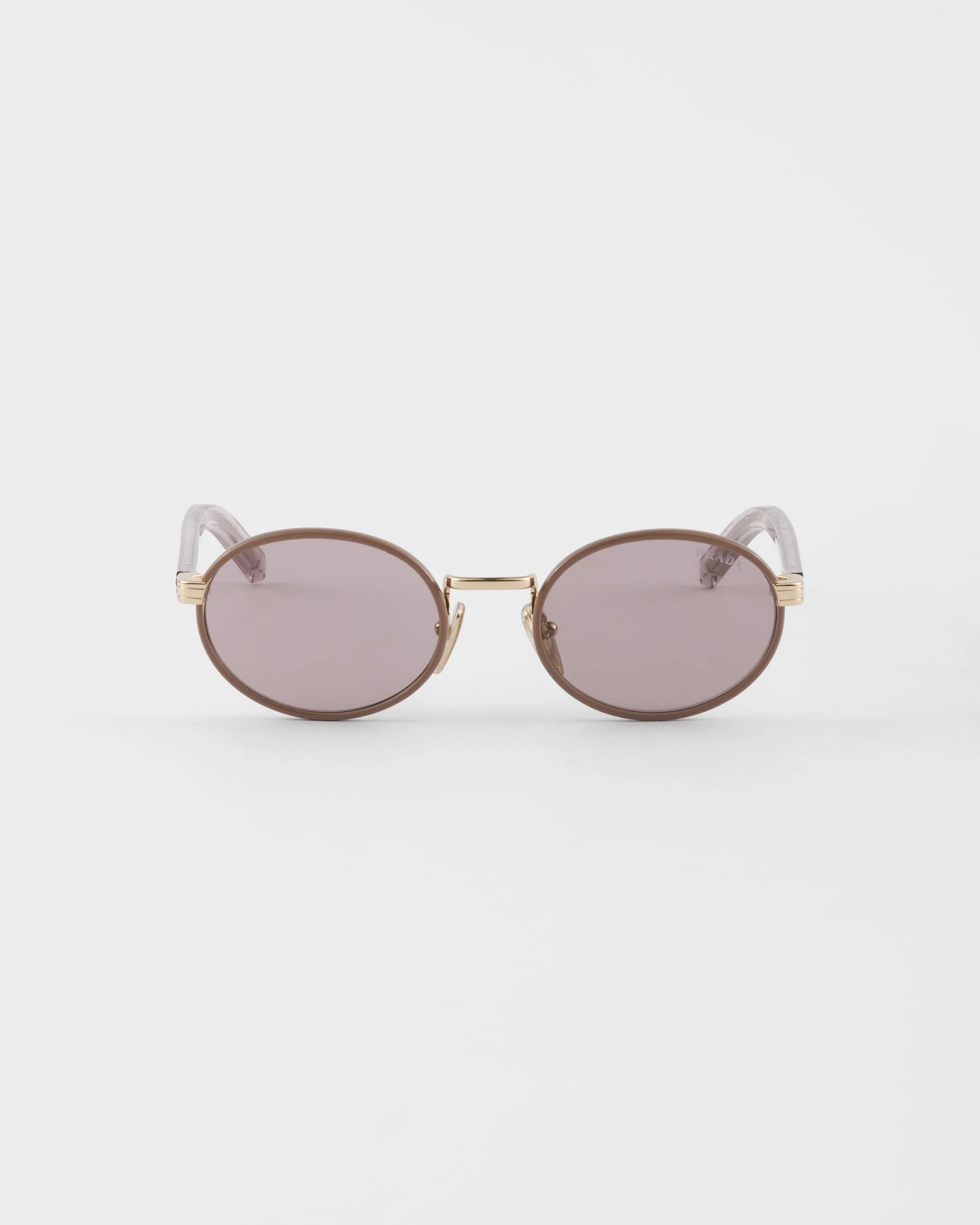 Sleek lines and refined details give these new Prada sunglasses a sense of contemporary elegance. The metal frame front has oval lenses enhanced by colored acetate rims. The slim temples are enriched by the metal plaque with the Prada lettering logo. - Product code: SPRB56_E24E_FE20I_C_052 - Metal frame front - Color: Pecan & Pale Gold - Frame compatible with graduated lenses - 100% UVA / UVB protection - Adjustable nose pads suitable for any fit - Lens-nose-temple measurement: 52-20-145 mm - Article comes with dedicated packaging - Other colors available - Imported MATERIALS Metal
