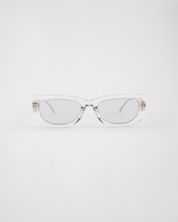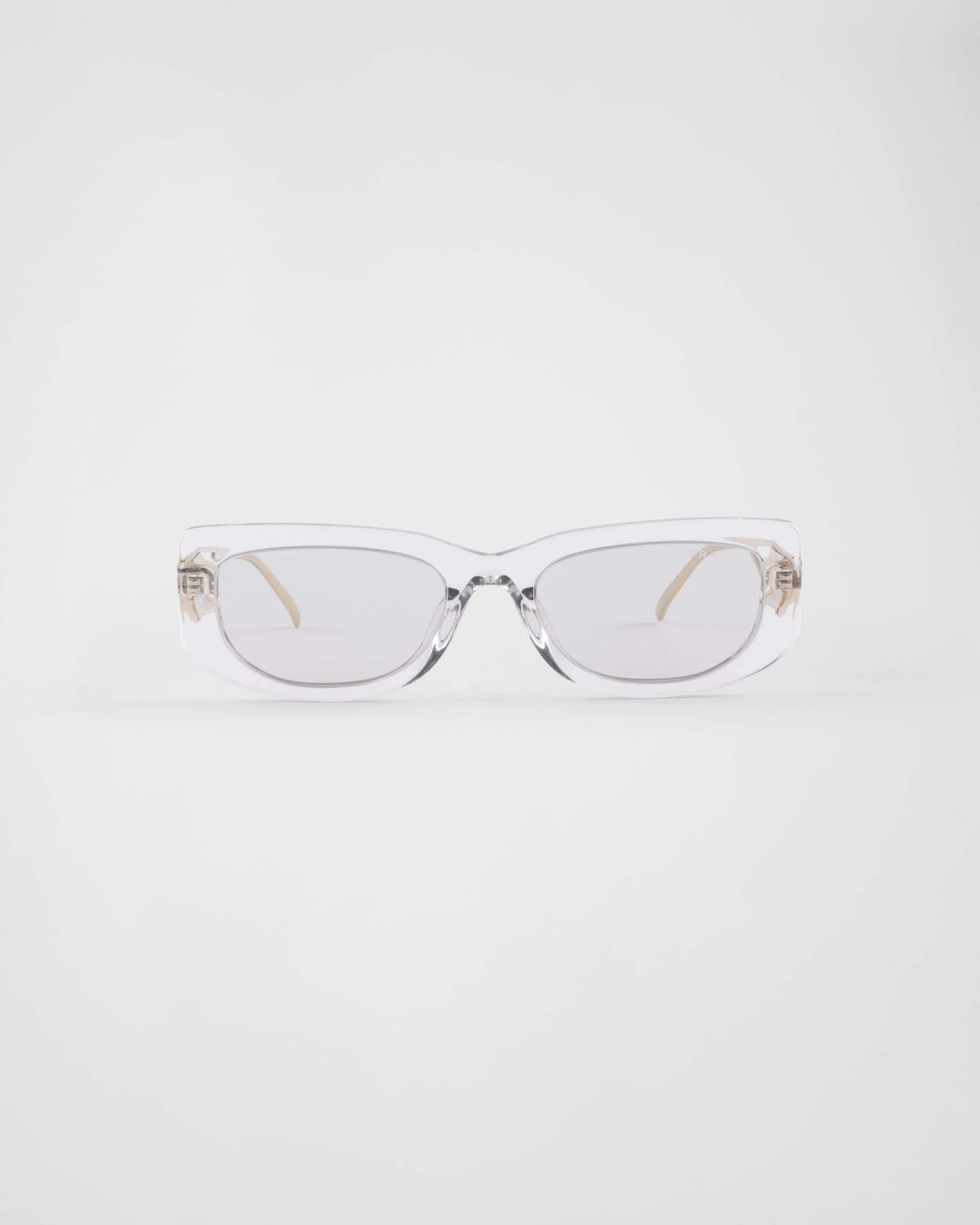 Acetate sunglasses with a glamorous touch. The rectangular front is combined with exclusive open metal temples decorated with the elegant insert of the Prada triangle logo inspired by the brand's jewelry. - Product code: SPR14Y_E12R_FE50K_C_053 - Acetate frame front - Color: Transparent gray - Frame compatible with graduated lenses - 100% UVA / UVB protection - Full Fitting - Lens-nose-temple measurement: 53-19-140 mm - Article comes with dedicated packaging - Other colors available - Imported MATERIALS Acetate
