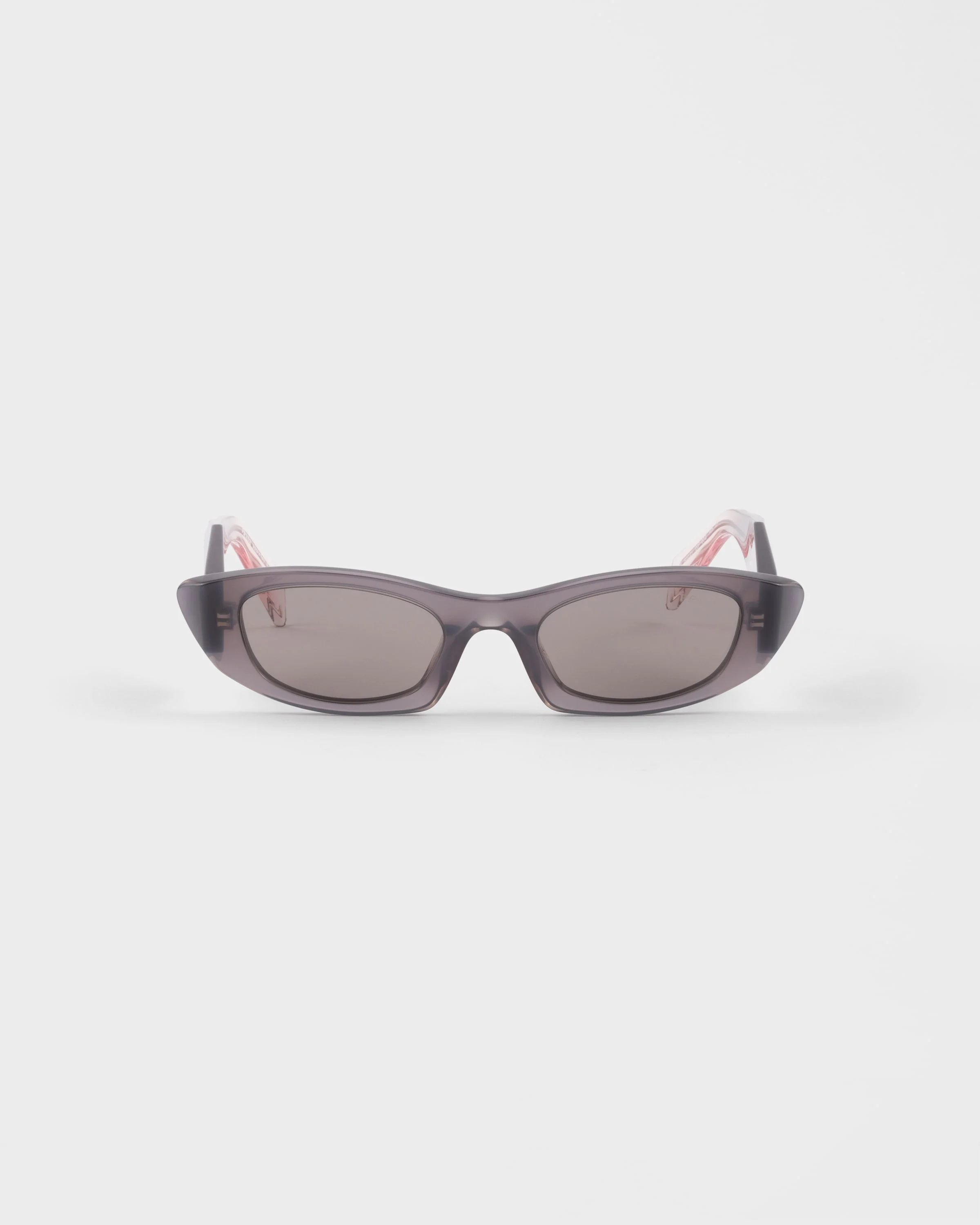 Acetate sunglasses with a bold attitude. The acetate frame features a narrow, geometric front and sharply beveled outer rims. The three-dimensional workmanship on the temples is decorated with an iconographic interpretation of the traditional Prada triangle logo. - Product code: SPRB16_E20F_FE80Q_C_050 - Recycled bio-acetate frame front - Color: Gray + Gradient Gray to Pink - Frame not compatible with graduated lenses - 100% UVA / UVB protection - Standard Fit - Lens-nose-temple measurement: 50-21-145 mm - Article comes with dedicated packaging - Other colors available - Imported MATERIALS Acetate