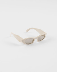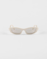 Acetate sunglasses with a bold attitude. The acetate frame features a narrow, geometric front with clean lines and beveled angular outer rims. The three-dimensional workmanship on the temples is decorated with an iconographic interpretation of the traditional Prada triangle logo. - Product code: SPRB16_E21D_F05J2_C_050 - Acetate frame front - Color: Milky White - Frame not compatible with graduated lenses - 100% UVA / UVB protection - Standard fit - Lens-nose-temple measurements: 50-21-145 mm - Article comes with dedicated packaging - Other colors available - Imported MATERIALS Acetate