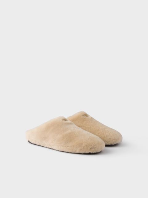 The design of these mules plays with soft volumes and winter textures that redefine the casual shoes with distinctive style. The shearling shoe is decorated with the iconic enameled metal triangle logo. - Product code: 1R130O_173_F0485_F_010 - Enameled metal triangle logo - Monoblock rubber sole, 10 mm, with hot-stamped logo - Imported MATERIALS Main material: Lambskin