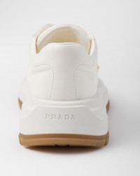 These leather sneakers with a sporty silhouette and pragmatic, modern design are characterized by a comfortable rubber sole. The shoe decorated with different interpretations of the Prada logo is completed by the distinctive touch of the iconic enameled metal triangle logo. - Product code: 1E804M_038_F0304_F_DE45 - Leather lining - Enameled metal triangle logo - Closure with polyester laces - Rubber sole: 45 mm - Removable leather-covered insole - Imported MATERIALS Main material: Lambskin