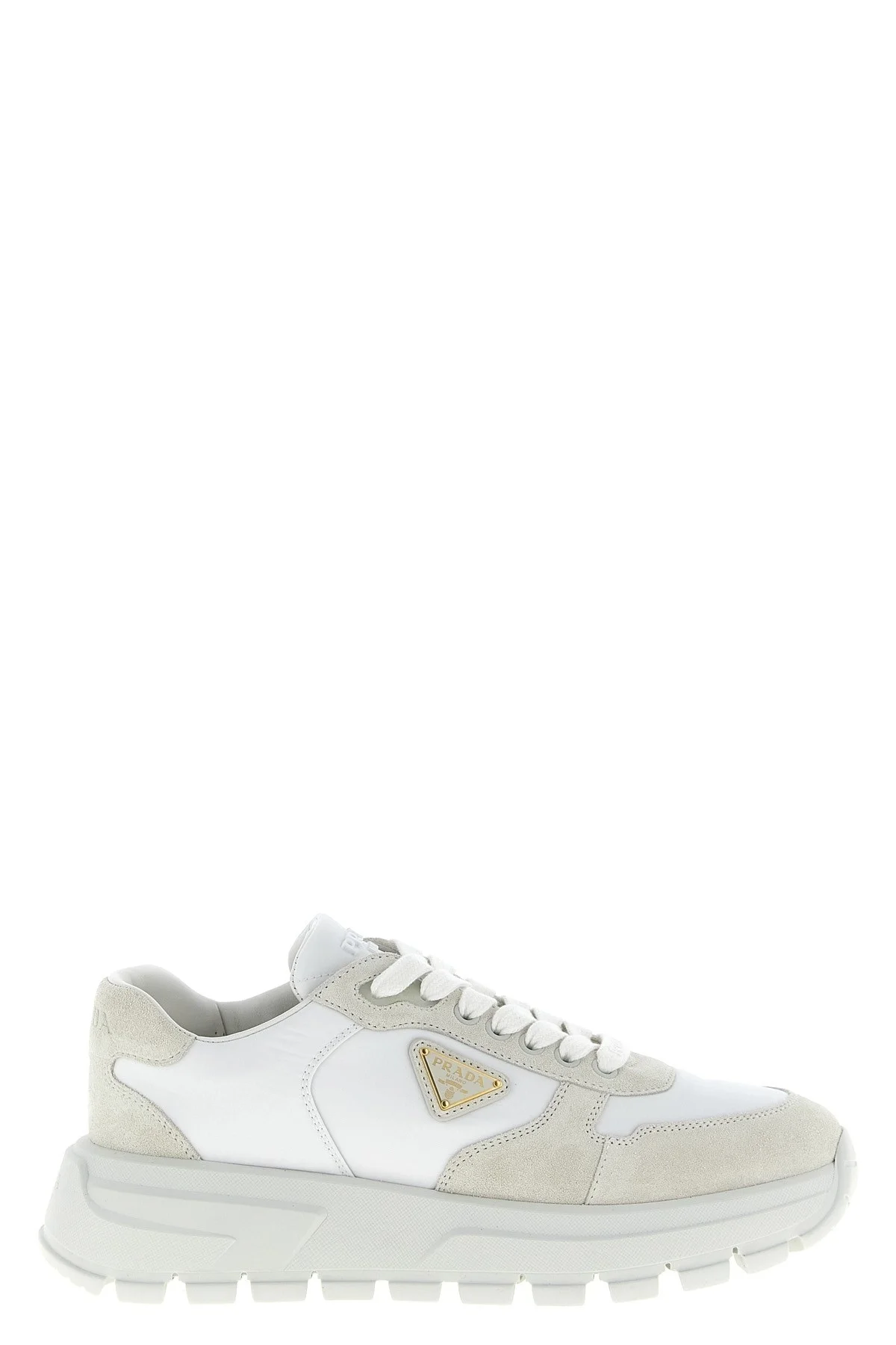 cod. 1E021OF045D7CF0009 'Prax 01' Re-Nylon and suede sneakers, side enameled metal triangle logo, lace-up closure, tone-on-tone silicone lettering logo on tongue, rubber sole. SUSTAINABLE: This product is made with Re-Nylon, a regenerated yarn made from recycled and purified plastic collected in oceans, fishery nets and textile fibers. Color: White Size & Fit: EU WOMAN - Heels: 4.5 cm Composition: 100% polyamide Made in: Italy