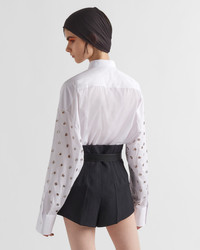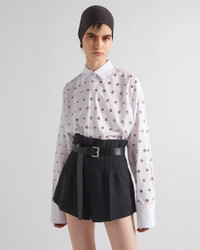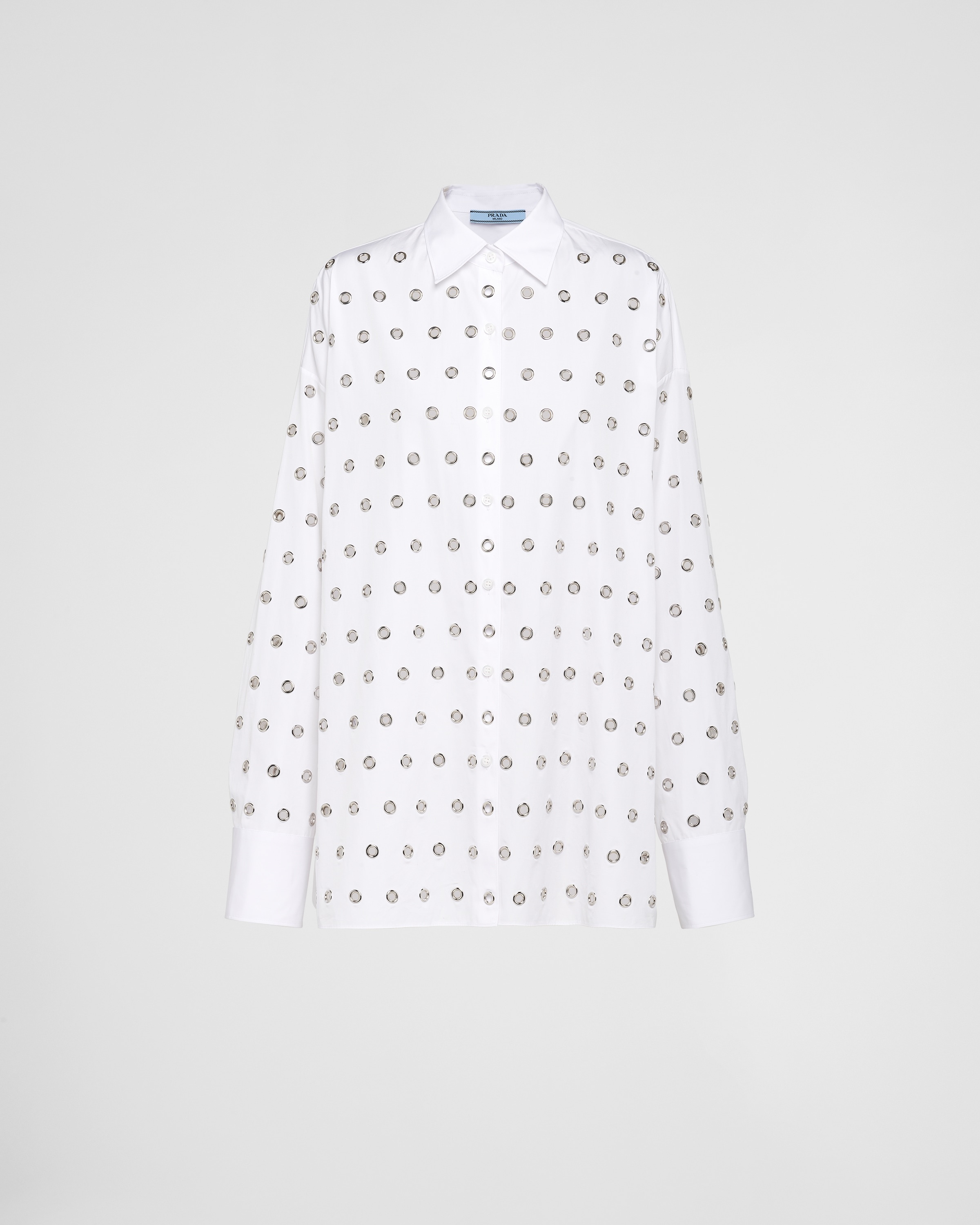 The poplin shirt with a menswear fit is reinterpreted with an oversized silhouette animated by original touches in a fusion of styles that revolutionizes a wardrobe classic. In a dual game of solids and voids, iconic metal grommets applied on the front embellish the style with sleek lines, introducing a sophisticated note. - Product code: P415HR_14Y8_F0009_S_OOO - Menswear fit - Shirt collar - Front button closure - Sleeves with shirt cuff - All-over grommet embellishment on the front and sleeves - Imported - The model is 180 cm tall and wears a size 38 Height: 72cm MATERIALS Cotton