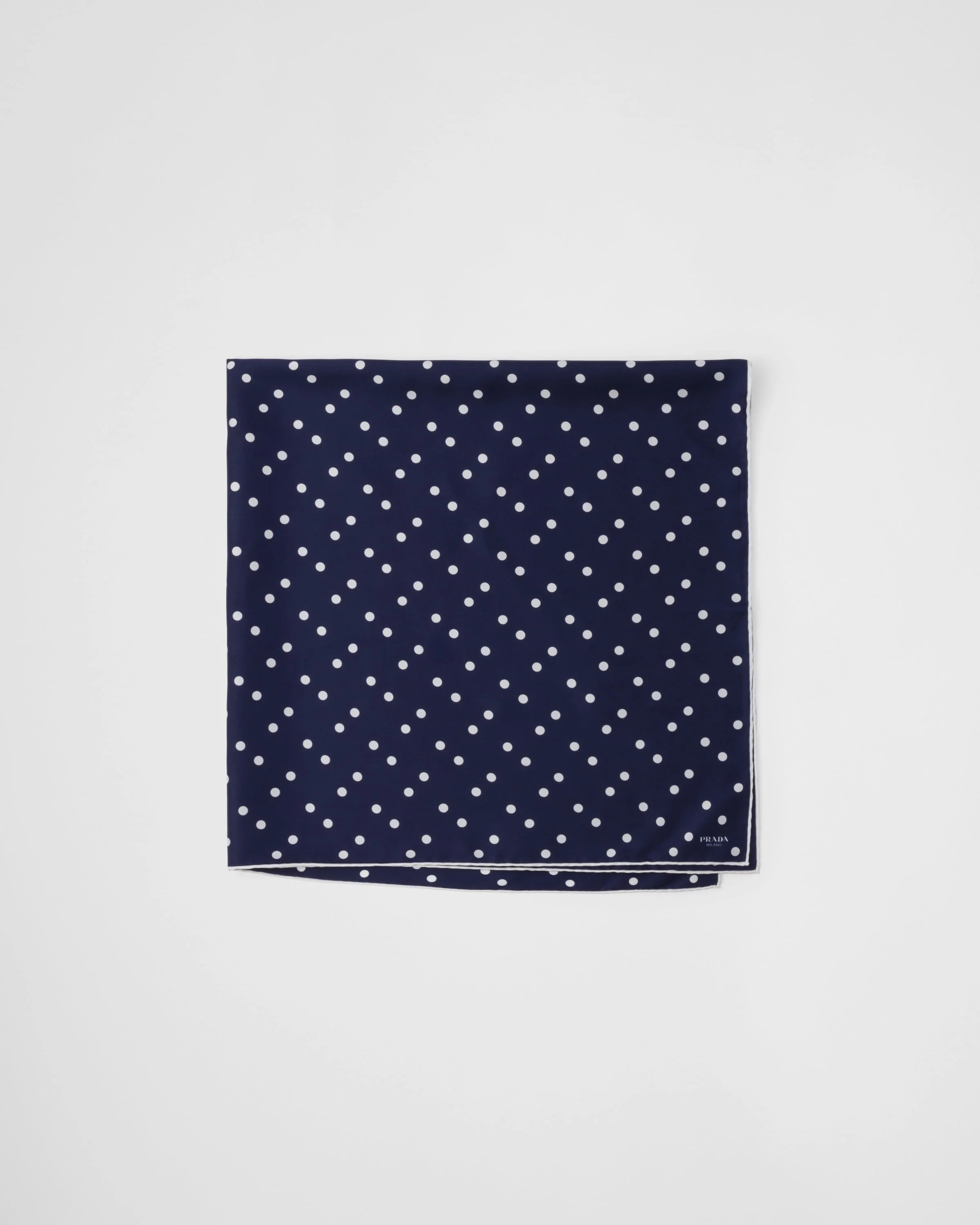 A sophisticated polka-dot print animates this fine silk twill scarf decorated with the lettering logo in a contrasting color. - Product code: 1FF001_2HH7_F0960 - Dots print - Enameled triangle logo - Imported Height: 90cm Width: 90cm MATERIALS Main material: Silk