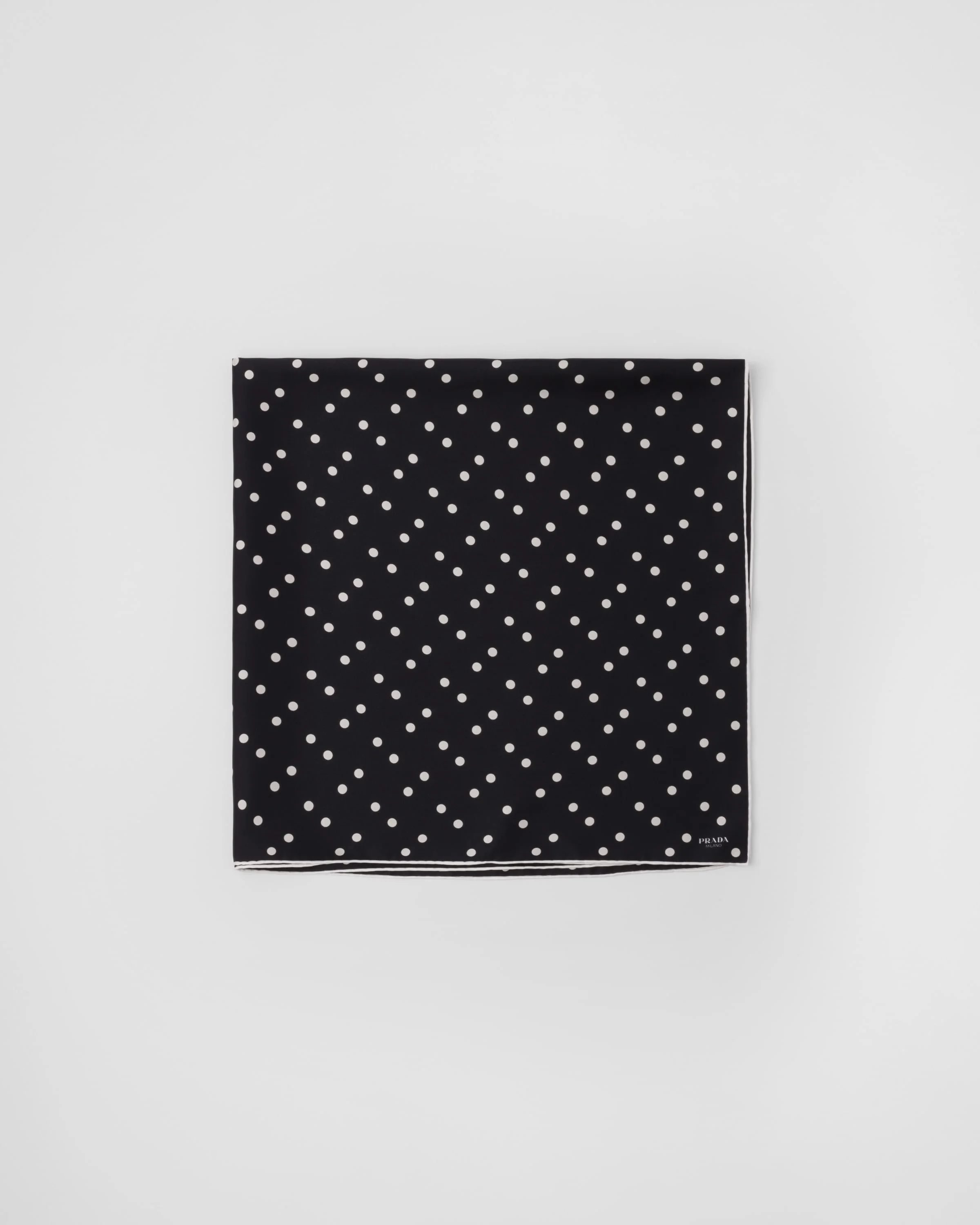 A sophisticated polka-dot print animates this fine silk twill scarf decorated with the lettering logo in a contrasting color. - Product code: 1FF001_2HH7_F0967 - Dots print - Enameled triangle logo - Imported Height: 90cm Width: 90cm MATERIALS Main material: Silk