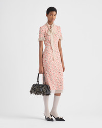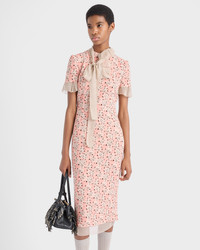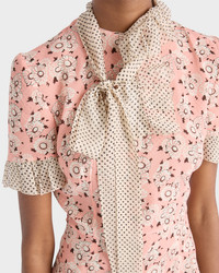 Two prints with vintage allure animate this stretch georgette dress with a sheath silhouette. The dress is characterized by a floral motif in contrast with the polka-dot ruffles that add a light, romantic touch. - Product code: P3Q04_17GO_F0D61_S_OOO - Sheath dress silhouette - Lined garment - Stand-up ruffled collar - Back zipper closure - Short sleeves with ruffled trim - Imported - The model is 177 cm tall and wears a size 38 Height: 110cm MATERIALS Main material: 9% elastane 91% silk