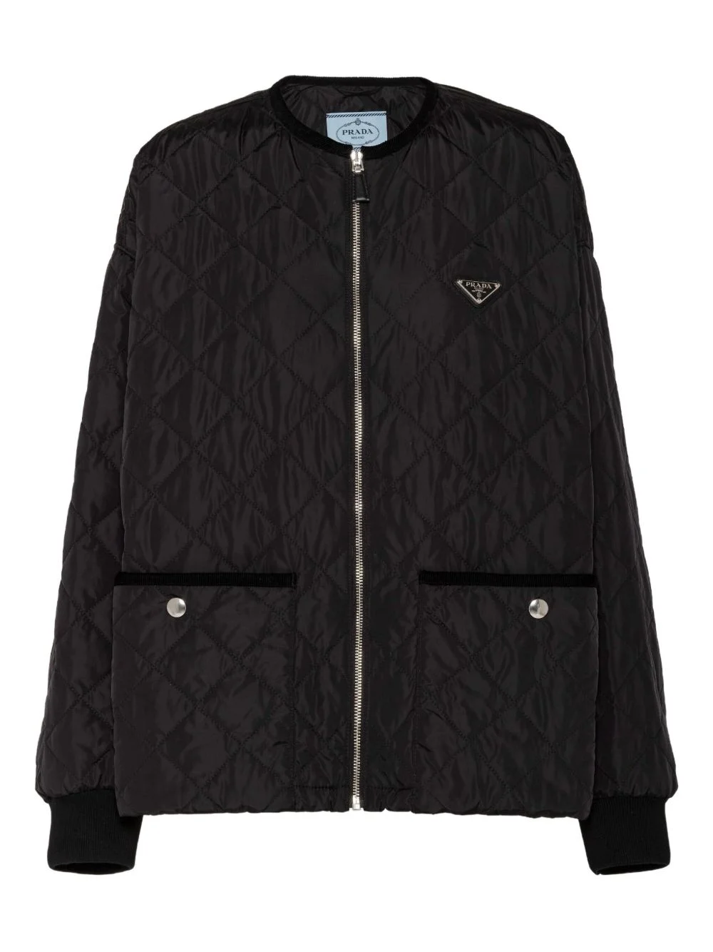 quilted corduroy-trim jacket Highlights - Black - Quilted exterior - Corduroy trim - Enameled metal triangle logo - Ribbed knit cuffs - Snap-fastening pockets Composition Nylon 100%