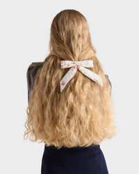 This romantic and delicate hair clip with bow is made of quilted satin embellished with a refined floral print. - Product code: 1IF154_1758_F0638 - Quilted - Clip closure - Enameled metal triangle logo - Imported Height: 3.6cm Width: 15cm MATERIALS Main material: Silk