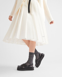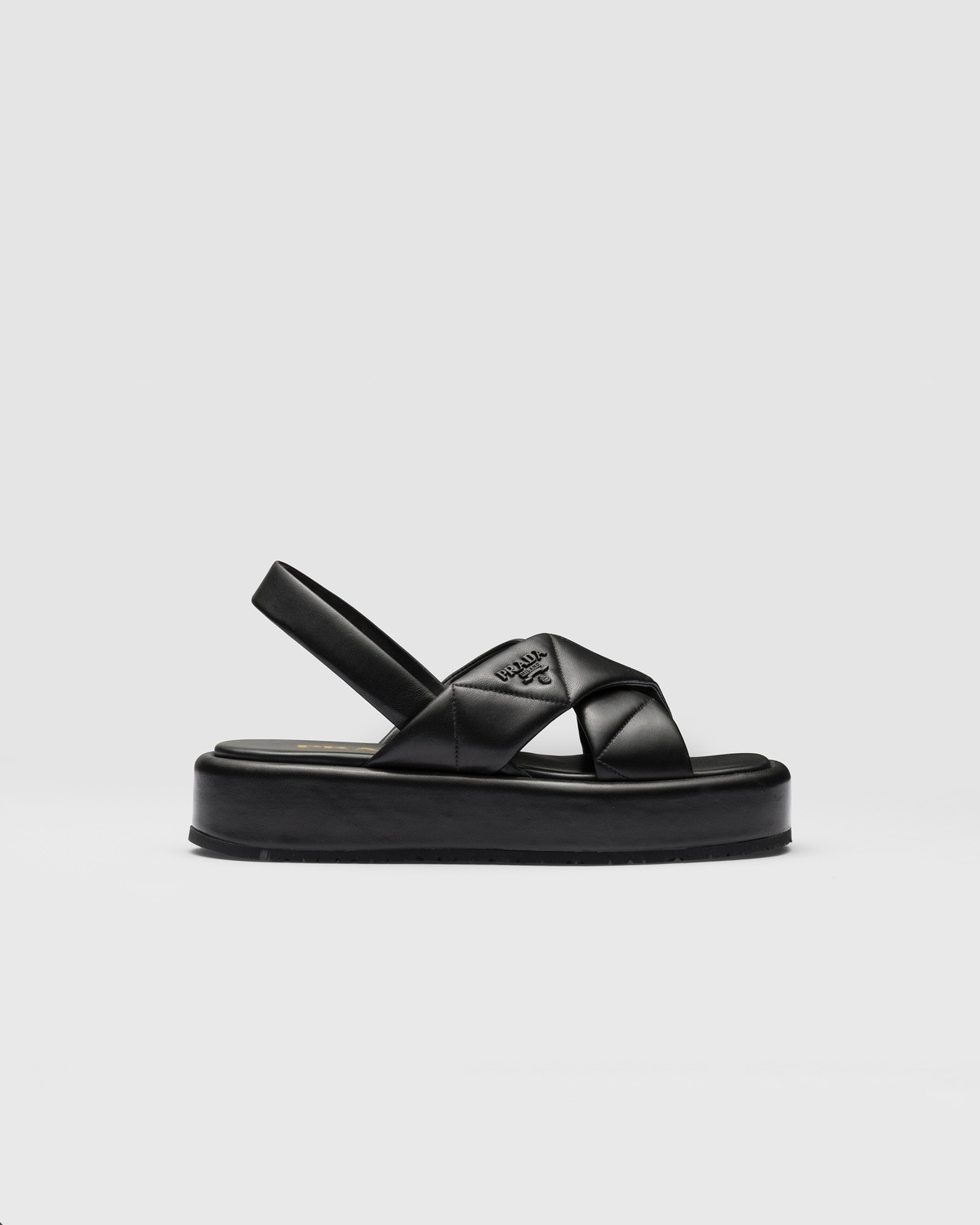 Volume, soft lines and references to the 90s define these sandals on a leather-covered flatform sole. The iconic Prada triangle is echoed in the quilted motif of the soft nappa leather of these sandals accented by the lettering logo. - Product code: 1XZ749_038_F0002_F_035 - Metal lettering logo - Rubber monoblock sole with hot-stamped logo - 35 mm leather-covered flatform sole - Tread with triangle pattern MATERIALS Leather