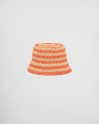 This bucket hat with contemporary allure is made of raffia, a natural material that recalls a summery atmosphere. Prada's emblematic lettering logo decorates the accessory animated by the stripe pattern. - Product code: 1HC137_2D1N_F0P6K - With stripes - Lettering logo MATERIALS Straw/Wicker