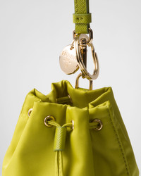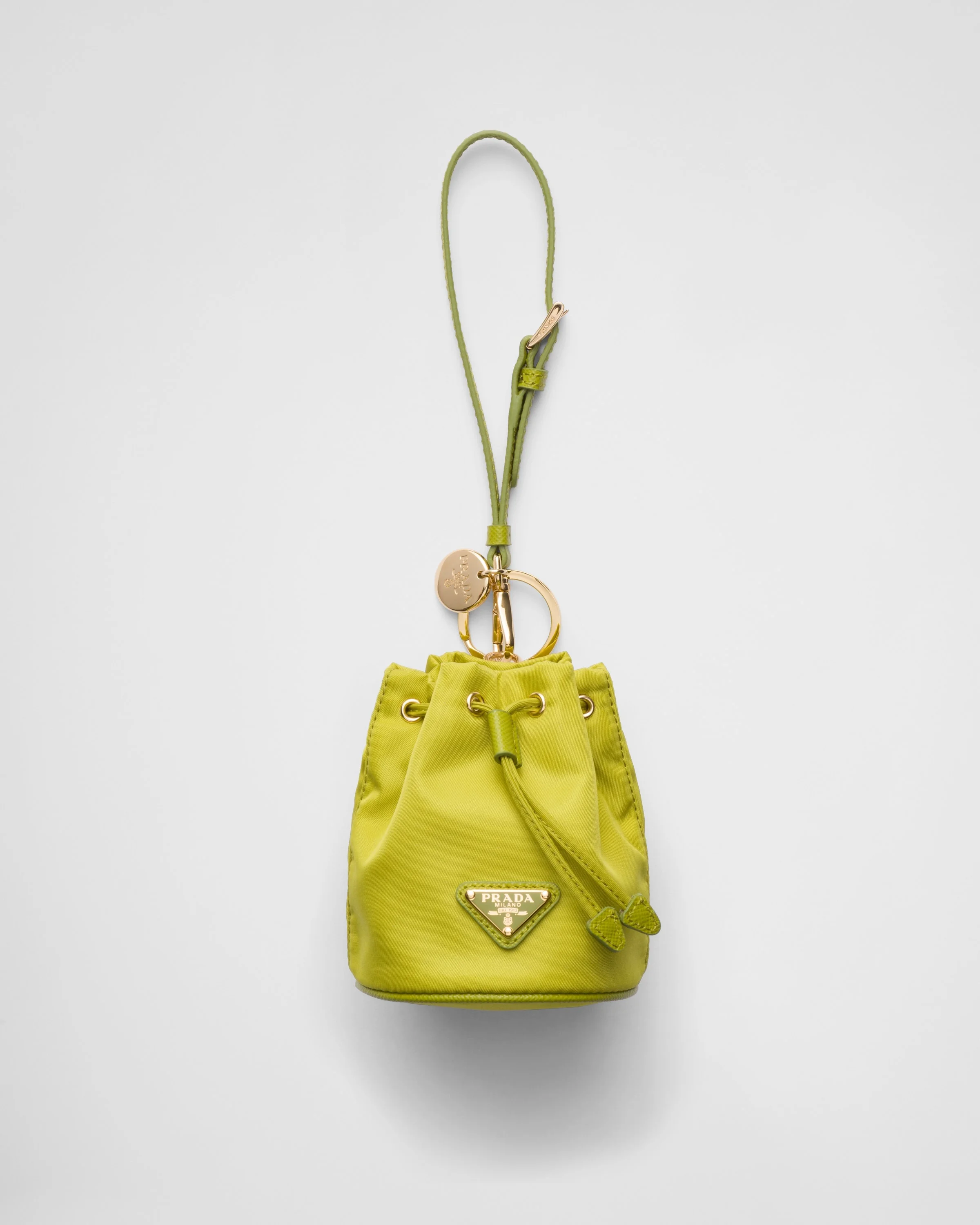 This mini-pouch bag charm, inspired by an archive design, is made of Re-Nylon, the sustainable evolution of a distinctive material of Prada collections. The style combines the functionality of regenerated nylon with refined details like the leather wristlet and gold-tone hardware. The enameled metal triangle logo enhances the accessory with an iconic touch. For sustainable care to preserve the product's characteristics and reduce microfiber shedding, we recommend not washing the item too often. Let the product air out after every use and have it dry cleaned at a specialized ecological dry cleaners. - Product code: 1TT202_2DMK_F0EBR - Detachable leather wristlet - Enameled metal triangle logo - Imported Height: 10.5cm Width: 8.5cm MATERIALS Main material: Recycled polyamide