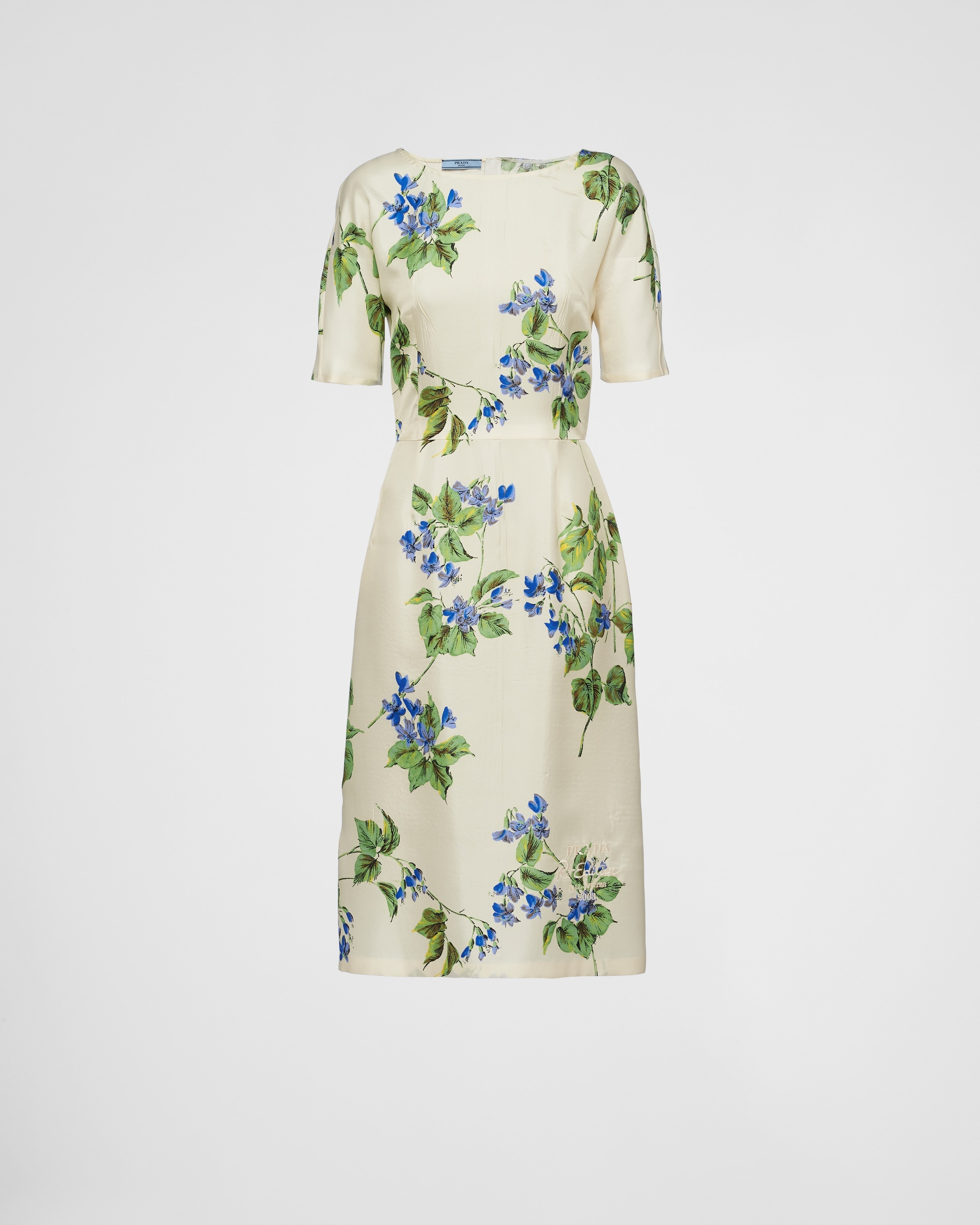An elegant floral print embellishes this midi-dress, a re-edition of a design from the Fall/Winter 2003 collection. Made of fine silk twill, the dress has a sheath silhouette with sleek lines and a boat neck, enhanced by the delicate archive floral motif. The Re-Edition logo embroidered on the hem completes the feminine and sophisticated garment. - Codice articolo: P3L96R_14NZ_F0K74_S_OOO - «Violet» print - Sheath silhouette - Unlined - Boat neck - Center back zipper closure - Short sleeves - Embroidered logo - Straight hem - Importato - The model is 179 cm tall and wears a size 38 - Altezza: 105cm