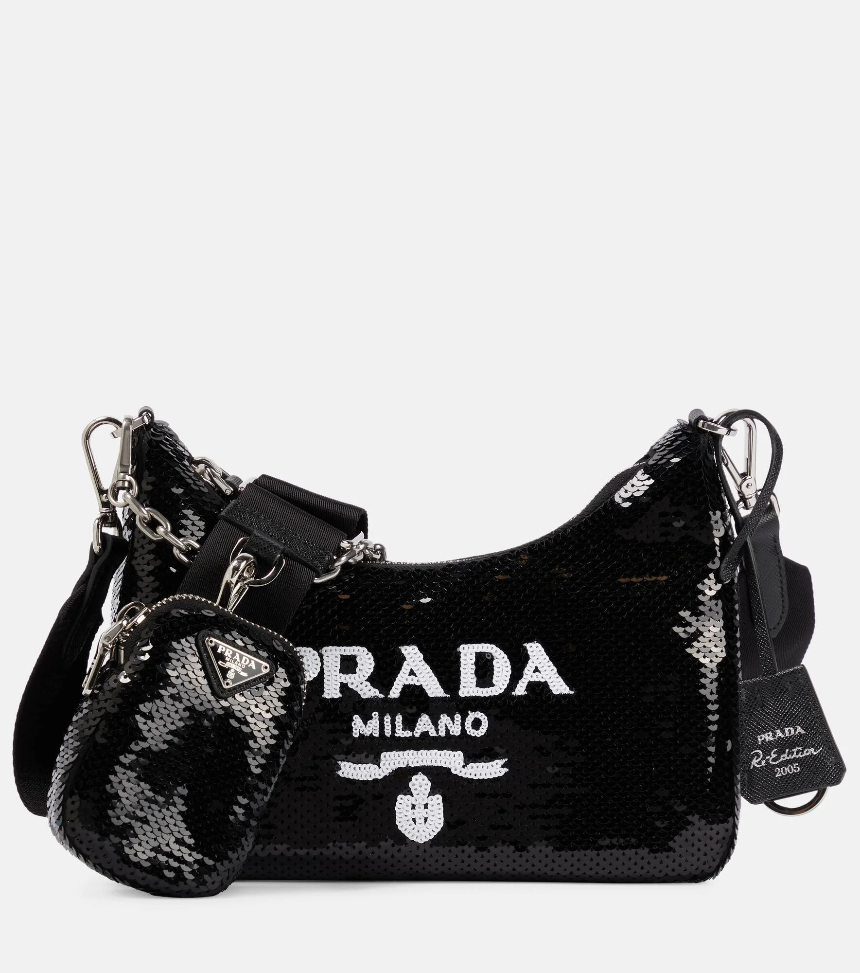 Updated with sequin-embellishments, this Small shoulder bag is Prada’s latest take on the beloved Re-Edition 2005 silhouette. Made from nylon, it has versatile straps and a removable pouch and keychain that Prada fans will love. Product Details - Closure: zipped top - Detachable chain shoulder strap, Detachable, adjustable shoulder strap - Designer color name: Nero+Bianco - Material: fabric - Made in Italy - Comes with dust bag - Comes with a box - Item number: P00696082 Size & Fit - Max. height 12cm-4.5" - Min. width 17cm-6.5" - Max. width 23cm-9" - Depth 7cm-3" - Chain length 47cm-18.5"