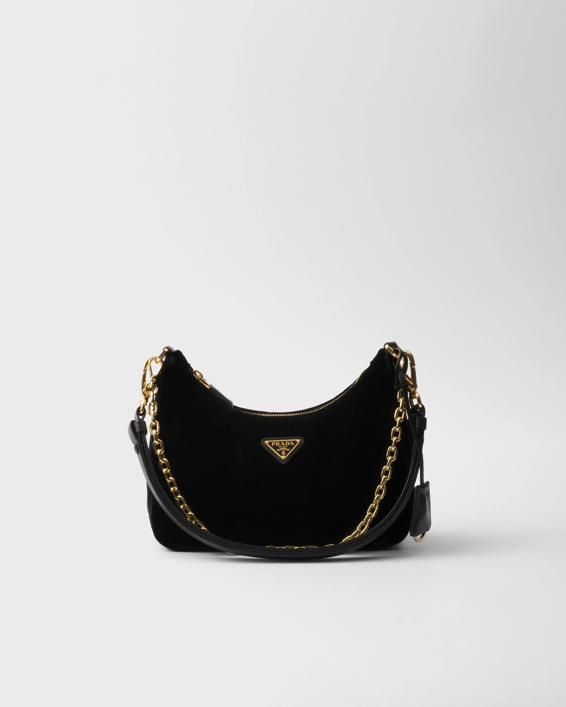 This refined and contemporary mini-bag has a sophisticated silhouette emphasized by the soft texture of velvet. The accessory decorated with the iconic enameled metal triangle logo is enhanced with leather details and metal hardware in a contrasting color. - Product code: 1BC204_2C7Q_F0002_V_JOO - Detachable, adjustable chain and leather handle - Removable leather key ring - Metal hardware - Enameled metal triangle logo on the front - Zipper closure - Logo-print nylon lining - Imported Height: 18cm Width: 22cm Length: 6cm MATERIALS Main material: Cupro viscose