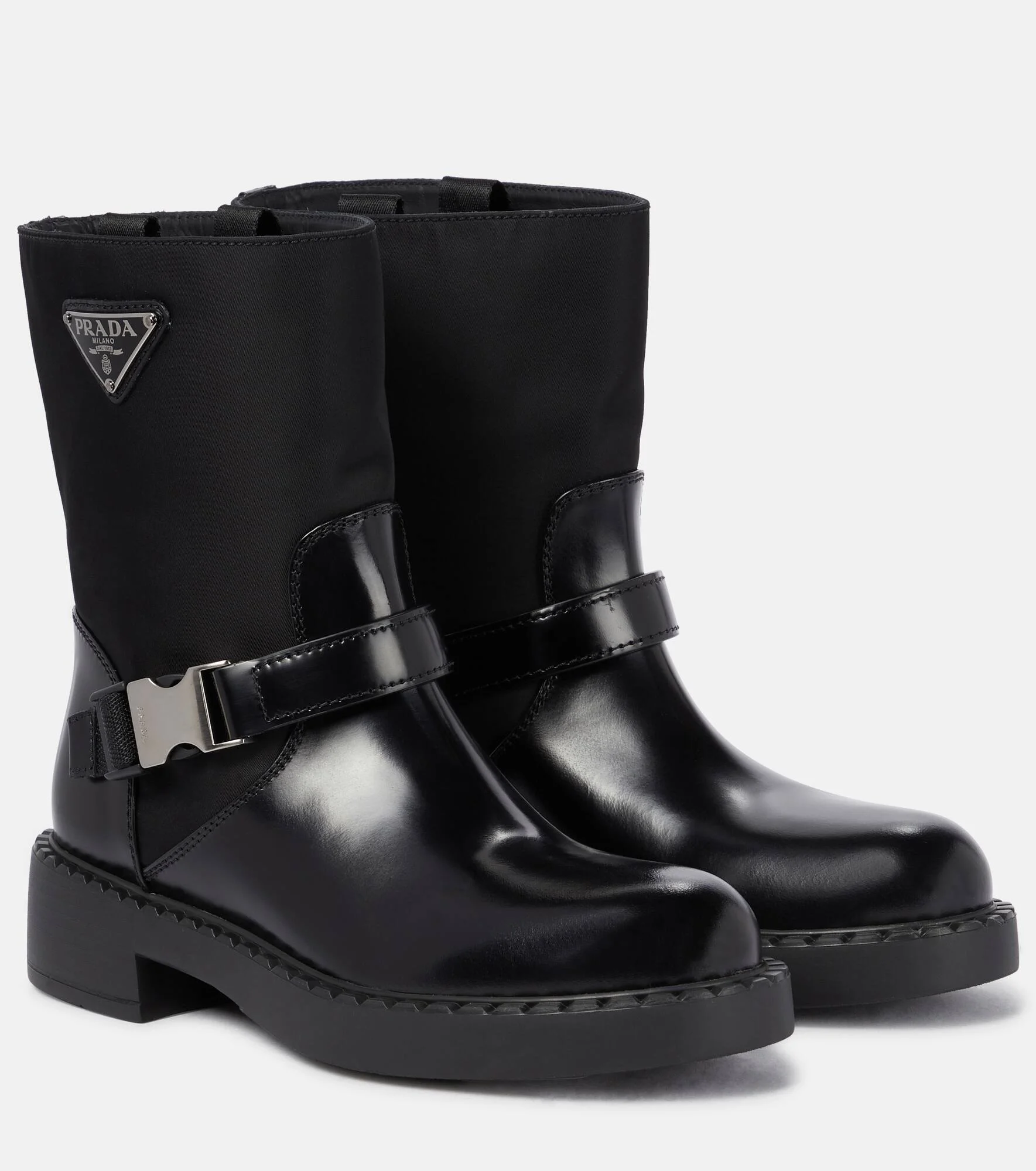 These black ankle boots from Prada will see you through the seasons. The shafts are made from durable Re-Nylon – a sustainable version of the brand's signature nylon; the uppers are made from brushed leather with a high-shine finish. Product Details - Upper: calf leather - Lining: fabric - Sole: leather insole, rubber sole - Toe shape: round toe - Made in Italy - Includes: shoe box - Designer color name: Nero - Closure: buckle fastening - Trim: fabric - Hardware color: silver - Item number: P00595251 Size & Fit - True to size - European sizes - 4cm-1.5" heel (size EU 38) - 2cm-1" platform (size EU 38)