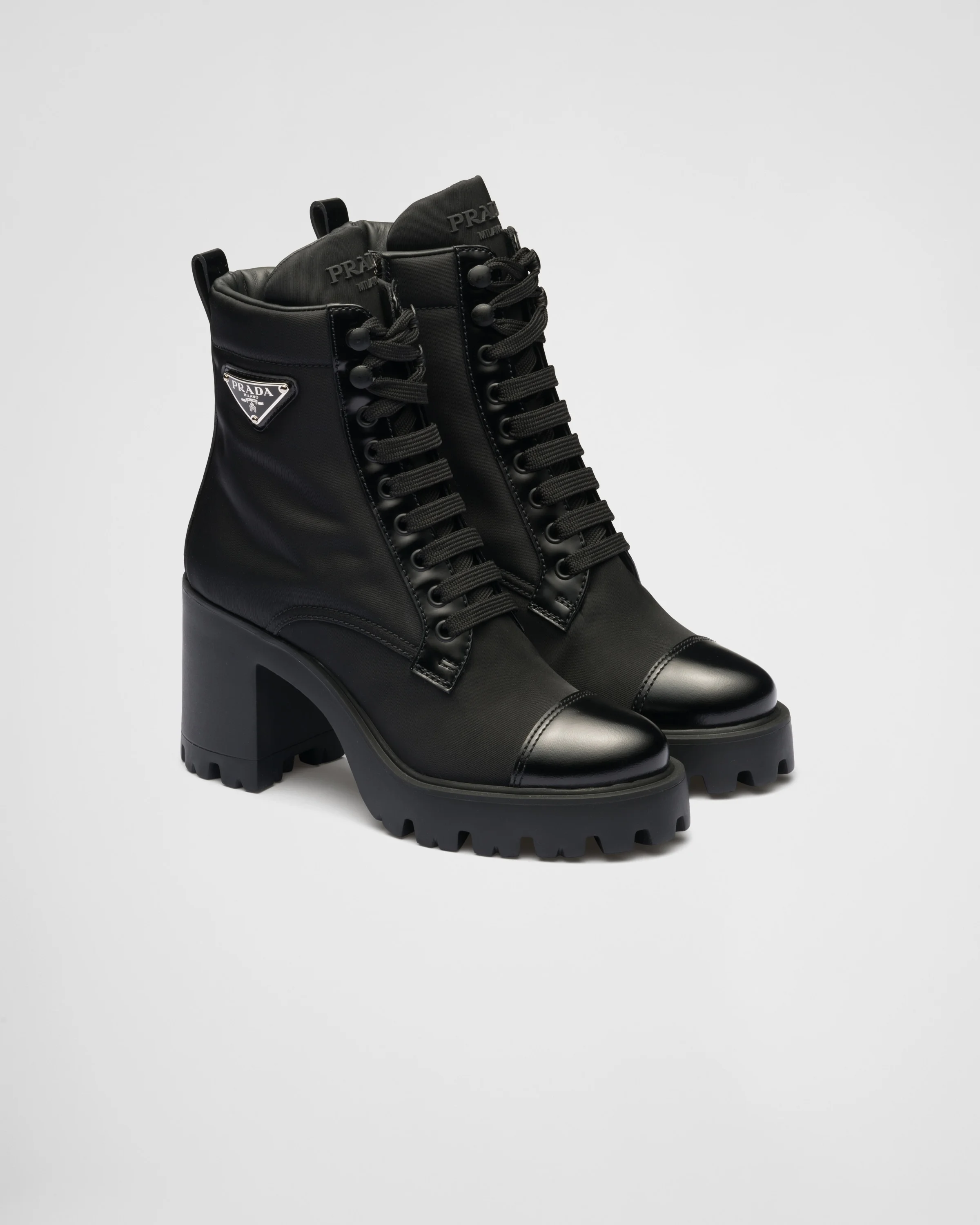 Rigorous formality reimagined in an innovative, modernist way inspires this versatile bootie that plays with different techniques and materials for an original result. The upper made of innovative Re-Nylon, which is obtained from recycled plastic collected in the ocean, contrasts in part with brushed leather while the rubber sole completes the design. This product does not contribute to the SEA BEYOND educational program. - Product code: 1T239N_3LFU_F0002_F_085 - Upper with flat polyester laces - Leather lining - Enameled metal triangle logo - 14 cm boot leg - 85 mm rubber monoblock sole - Stamped rubber welt - Imported MATERIALS Main material: Recycled polyamide