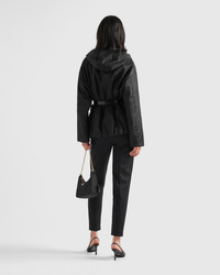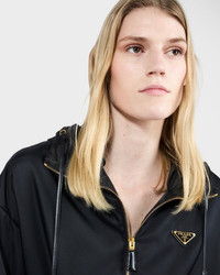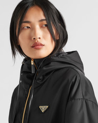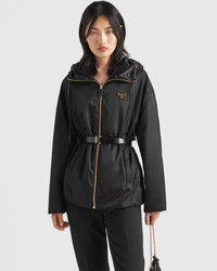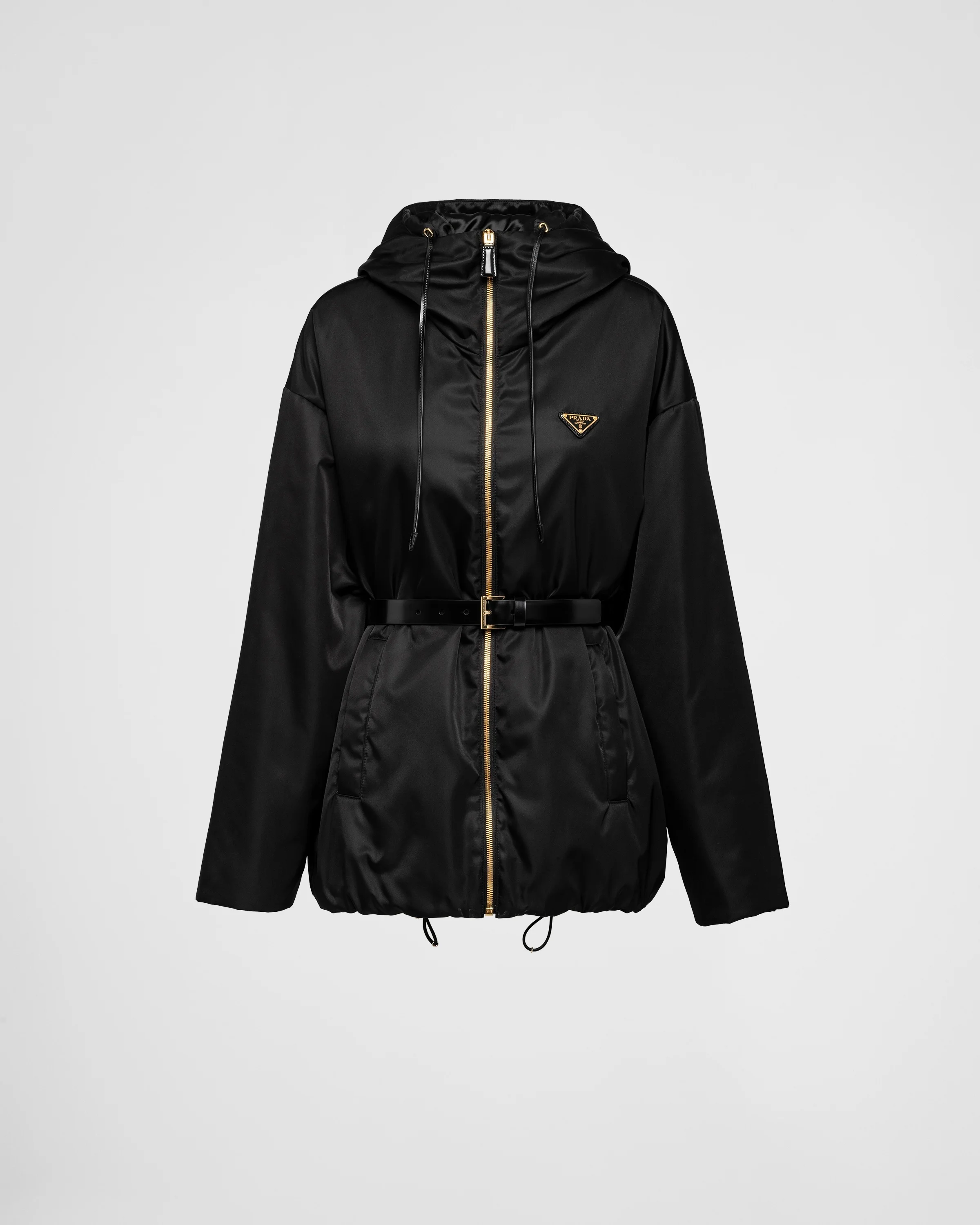 Enveloping lines and light volumes define the silhouette of this blouson jacket made of Re-Nylon, the innovative regenerated nylon yarn produced from recycled and purified plastic materials collected in the ocean. Combining sophistication and versatility, the padded design features functional details and is embellished with an elegant leather belt. The enameled metal triangle logo adds an iconic touch to the sporty style. For sustainable care to preserve the product's characteristics and reduce microfiber shedding, we recommend not washing the item too often. Let the product air out after every use and have it dry cleaned at a specialized ecological dry cleaners. - Product code: 29E097_1WQ8_F0002_S_232 - Padded lining - Hooded - Long sleeves - Straight cuff - Zipper closure - Welt zipper pockets - Enameled metal triangle logo - Elasticized drawstring hem - Log-print leather zipper pulls - Leather laces on the hood - Inside left pocket, with double welt and button - Leather belt with logo-engraved metal buckle - Comfortable regular fit, the garment fits up to one size larger - Imported - The model is 180 cm tall and wears a size 38 Height: 70cm MATERIALS Main material: 100% recycled polyamide