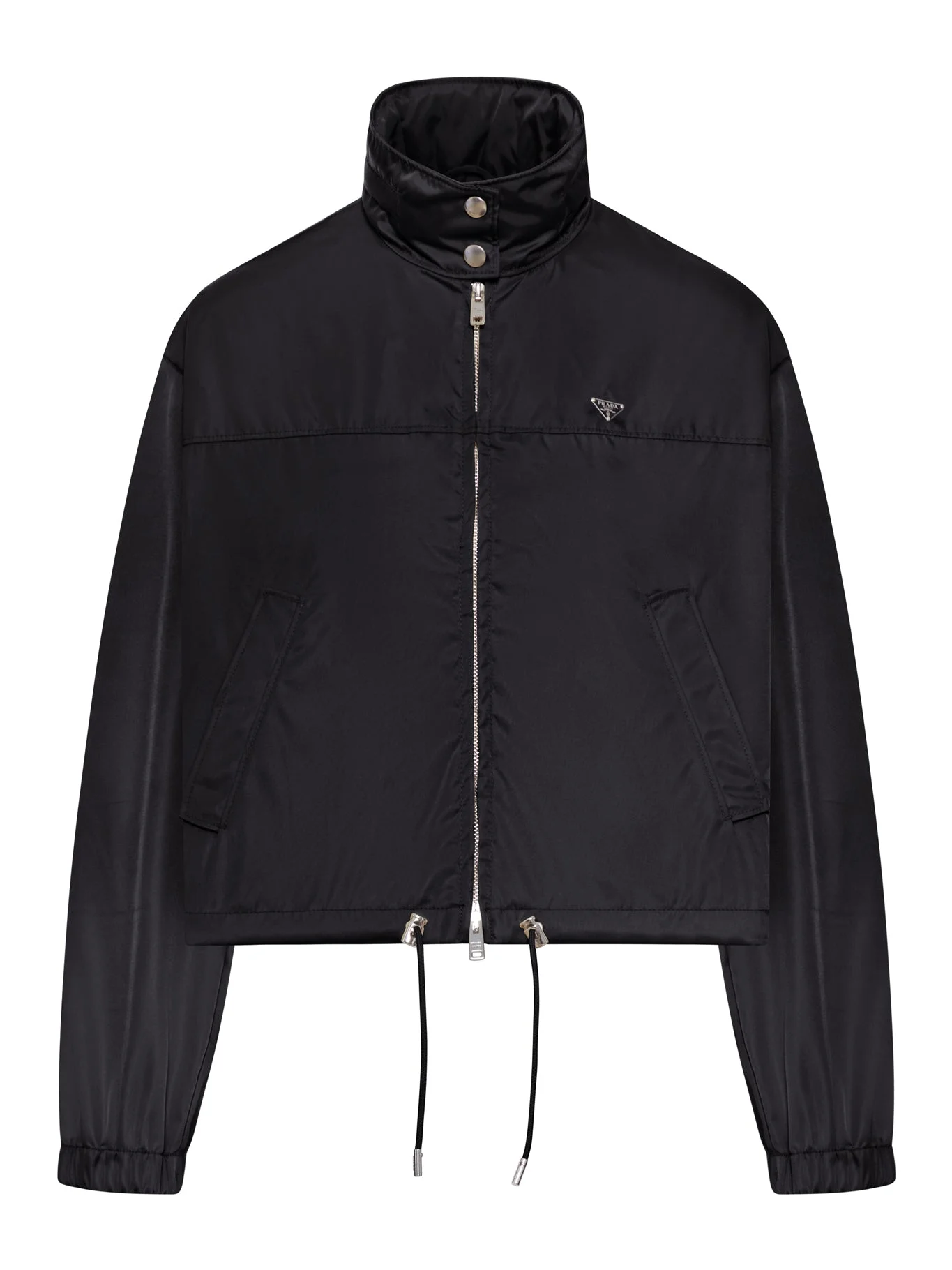 - High collar with hidden zip and internal hood - Two-way zip and two snap buttons - Tone-on-tone enamel triangle logo - Two slanted front pockets - Adjustable drawstring hem - Long sleeves with elasticated cuffs - Cropped fit - Technical fabric - Color: Black Made in Romania Composition: Polyamide 100% polyamide Color code: F0002 BLACK 292351SOOO1WQ8
